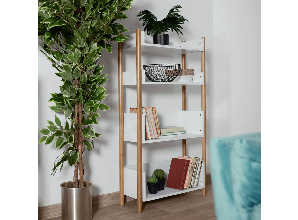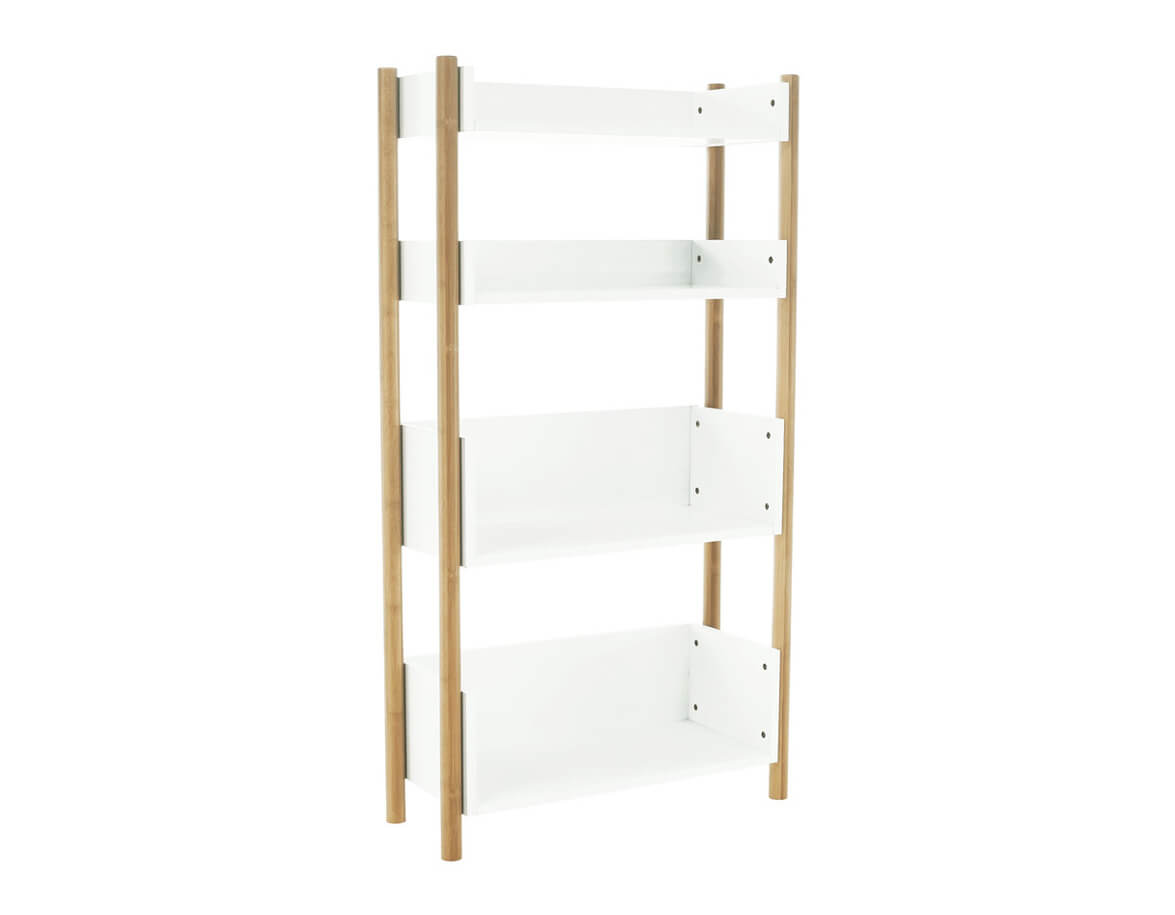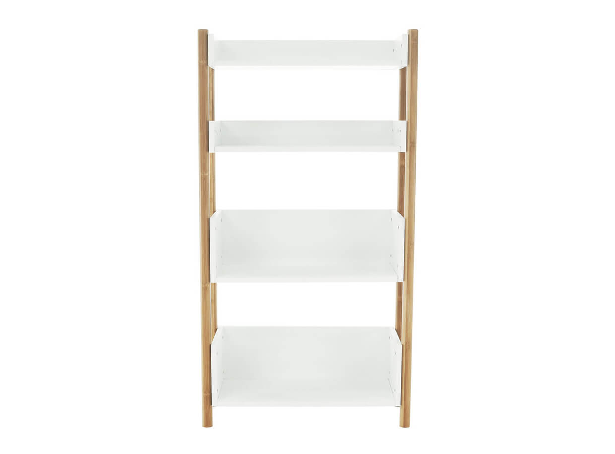 Az állvány szerkezete strapabíró tömör anyagból, természetes bambuszból készült, melyhez négy fehér polc van rögzítve.