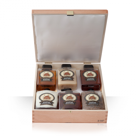 Ajándékcsomagolás - Sörös kozmetika (fából készült csomagolásban elhelyezett szett)
