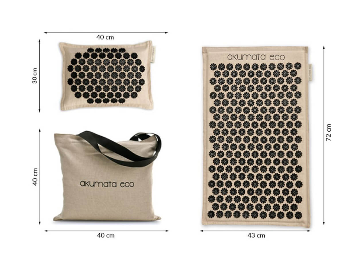 Használat: A szőnyeg ülve, fekve és állva is használható. Mindegyik módszernél a tüskék kellő nyomást hoznak létre a kívánt területen. Használhatja a szőnyeget a hát, a lábak, a karok és a csípő akupresszúrás masszázsára. A párna elsősorban nyak- és nyakmasszázsra készült, de elhelyezhető a csípő vagy a láb alatt.