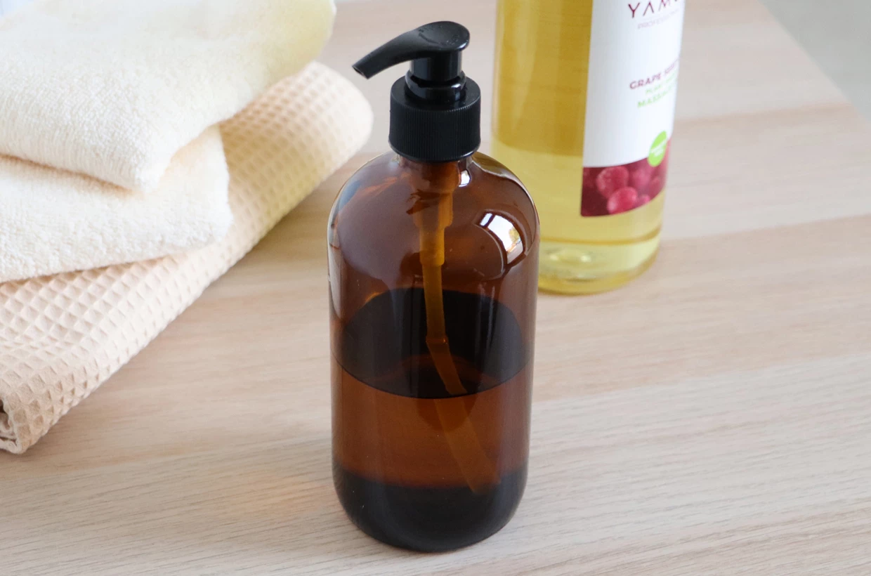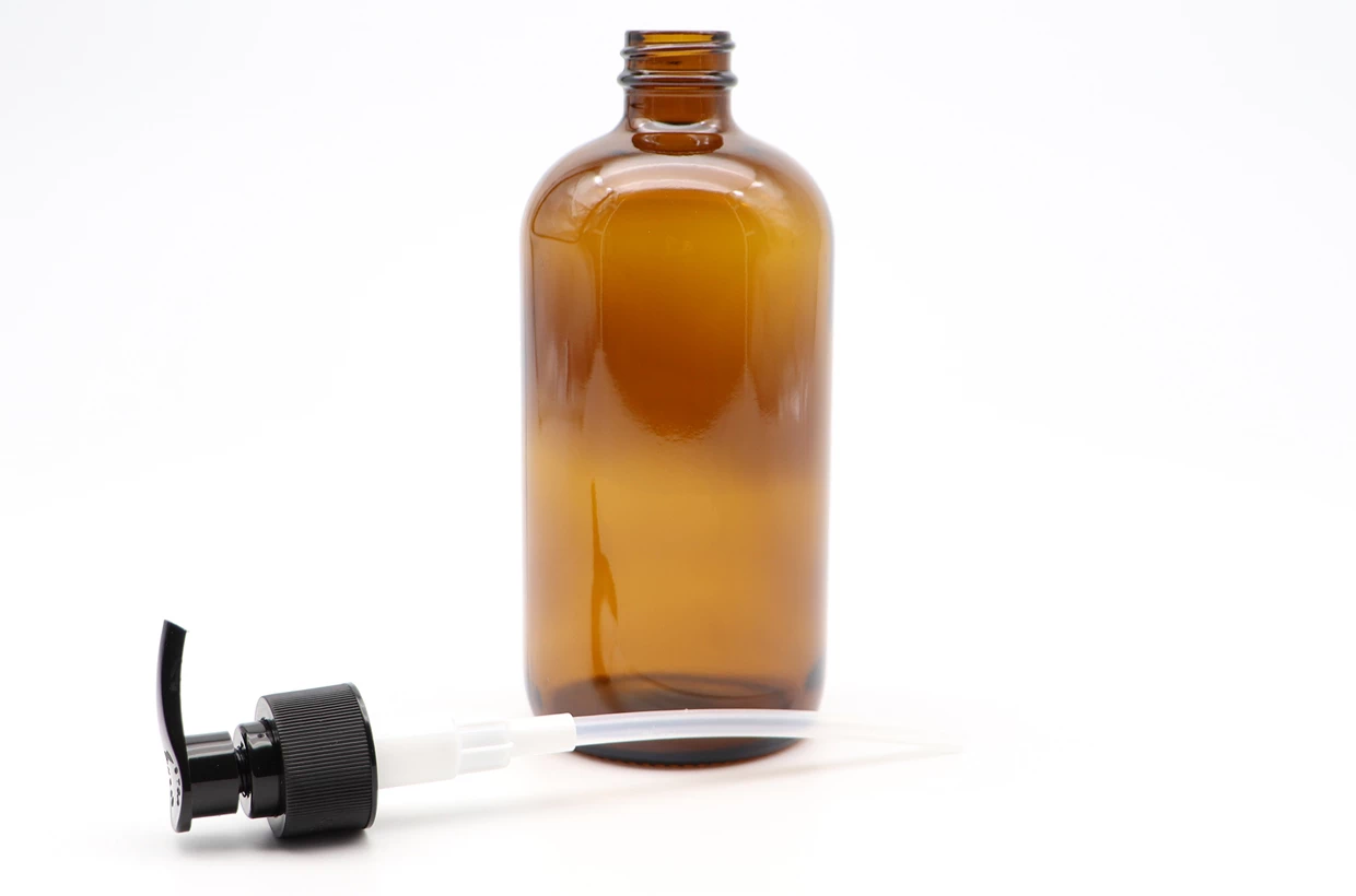 A borostyán üvegpalack adagolóval klasszikus, elegáns kialakítású, és különösen masszázsszalonokban és szépségstúdiókban használható.
