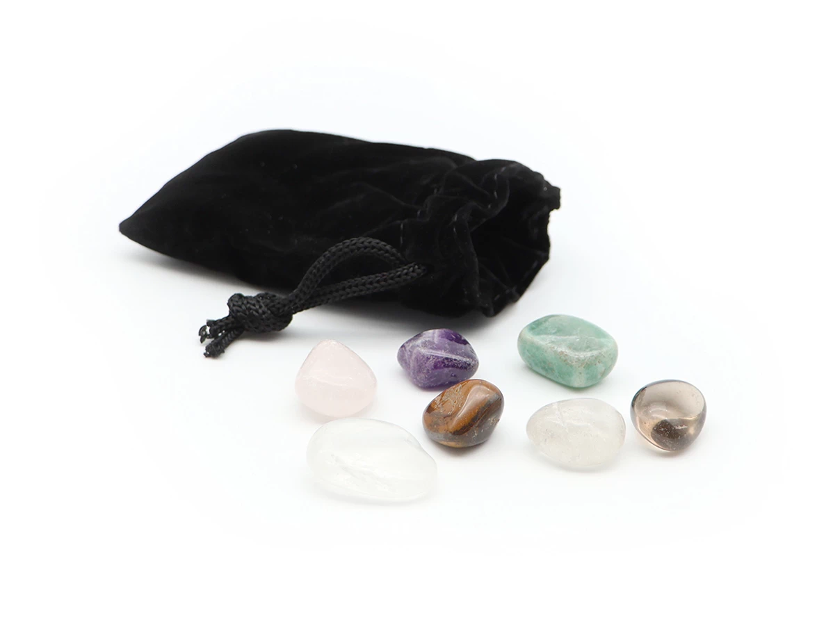 Zsinórral lehúzható fekete bársony tasakban 7 db csakrakövet talál az ajánlott elhelyezéssel (háton fekve / hason fekve):