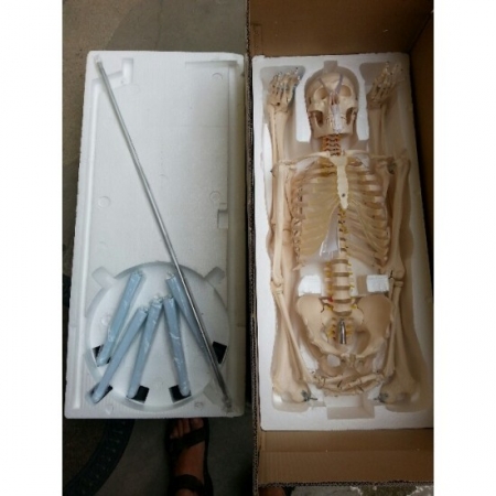 A felnőtt ember felosztott csontváza életnagyságban, ideális az alap emberi anatómia bemutatására. A kezek és a lábak lekapcsolhatóak az egyszerűbb áttanulmányozás érdekében. A csontváz idegágakat, csigolya artériákat és ágyéki lemezt tartalmaz. A koponyának leválasztható állkapcsa valamint három kivehető alsó foga van. A csontváz stabil, 40 cm széles fém állványra van állítva. Az anyag mosható, ellenálló PVC műanyag.