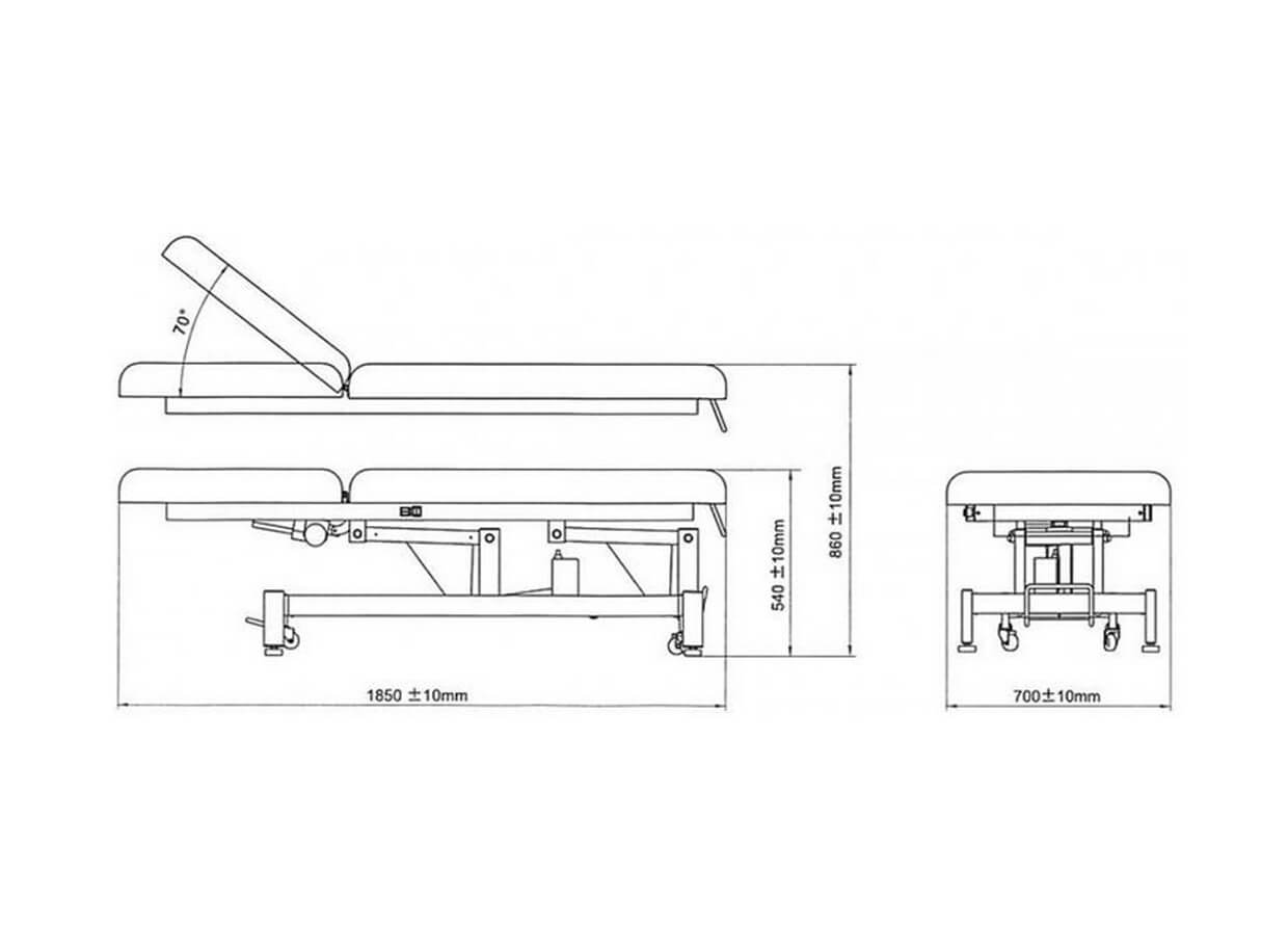 Az ágy oldalán két gomb található a 2 motor vezérlésére, amelyek az ágy magasságát és a háttámla dőlésszögét állítják be. Az ágy állítható magassága 54-86 cm, klasszikus szélessége 70 cm a legtöbb masszőr és masszázskezelés számára ideális és kényelmes a szépségszalonok vendégei számára is. Vízszintes helyzetben az ágy hosszúsága 185 cm.