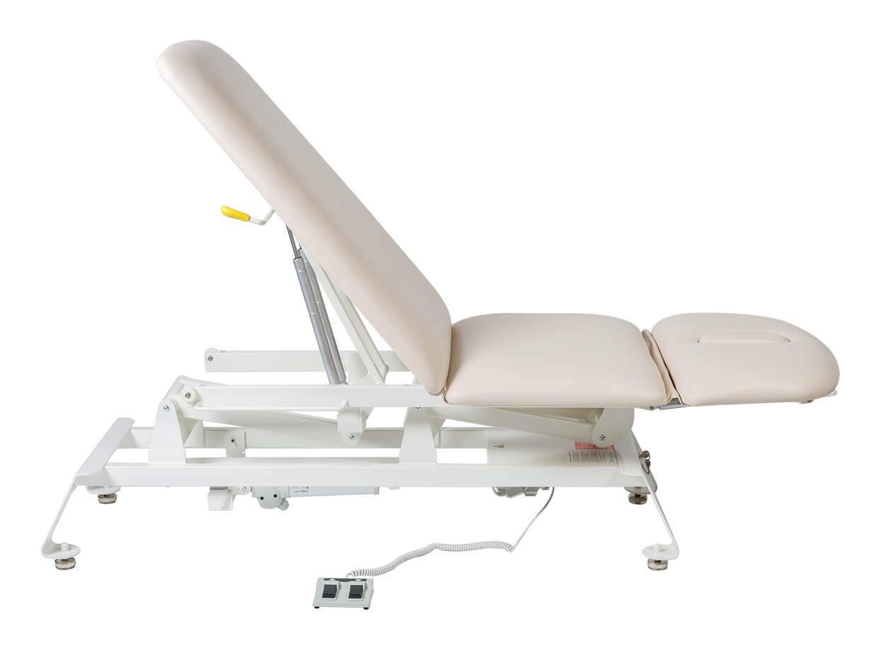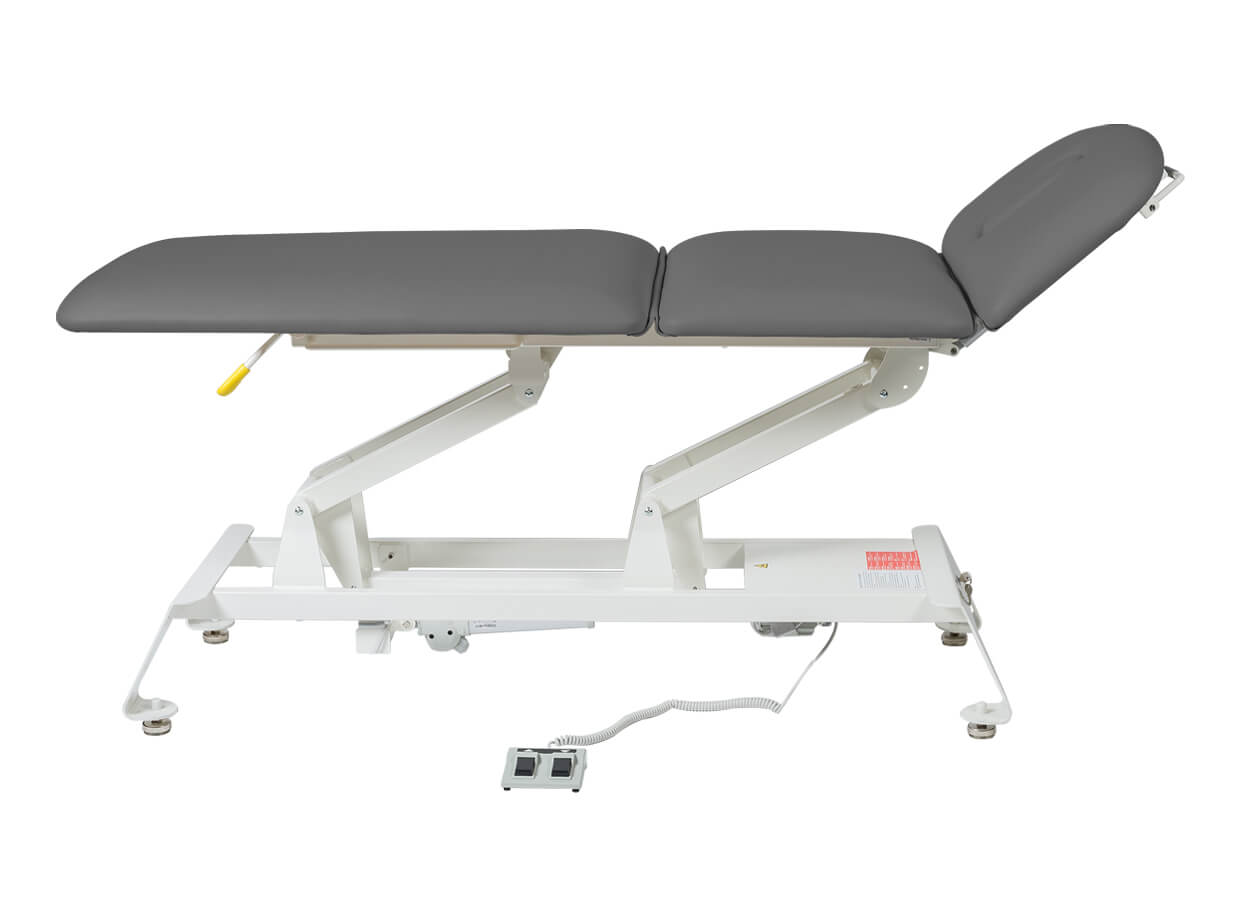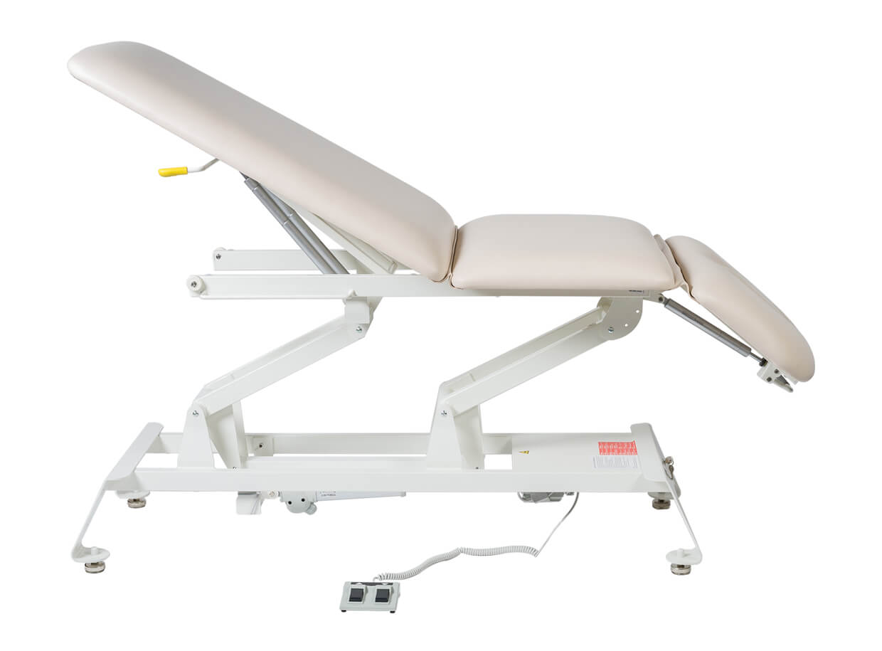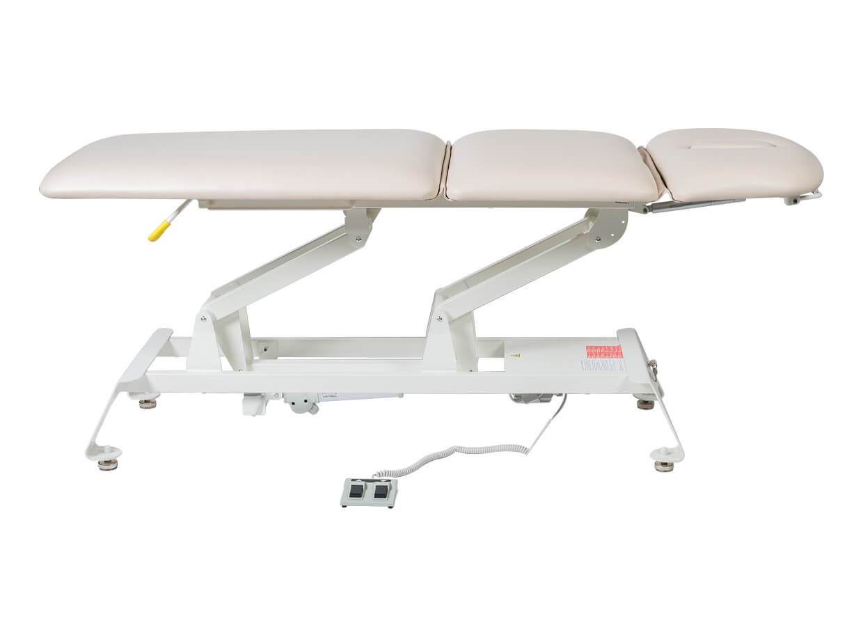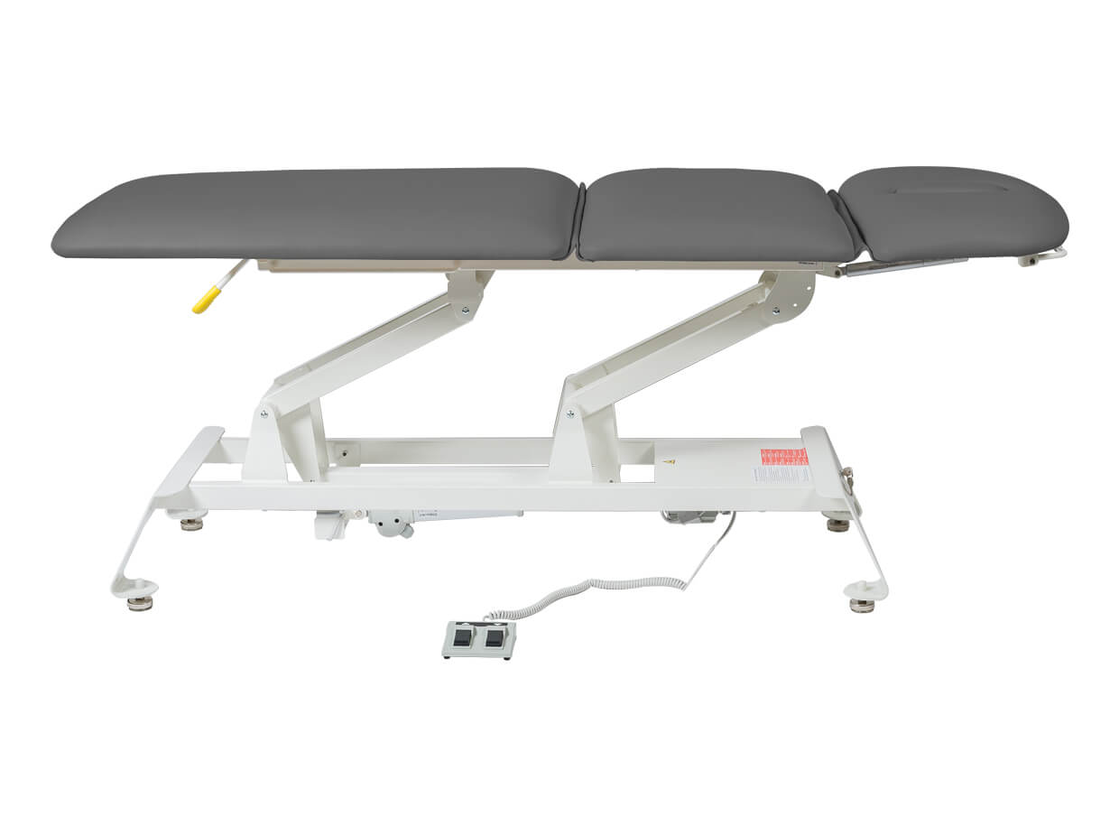 Három részes elektromos ágy állítható fej- és lábtámlával. Használható masszőr vagy kozmetikus szalonban, gyógytornásznál vagy orvosi rendelőben vizsgáló ágyként.