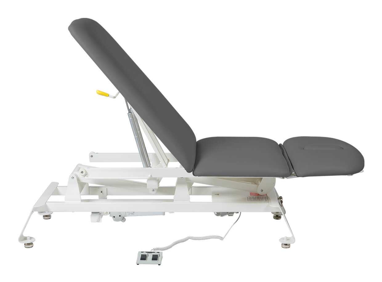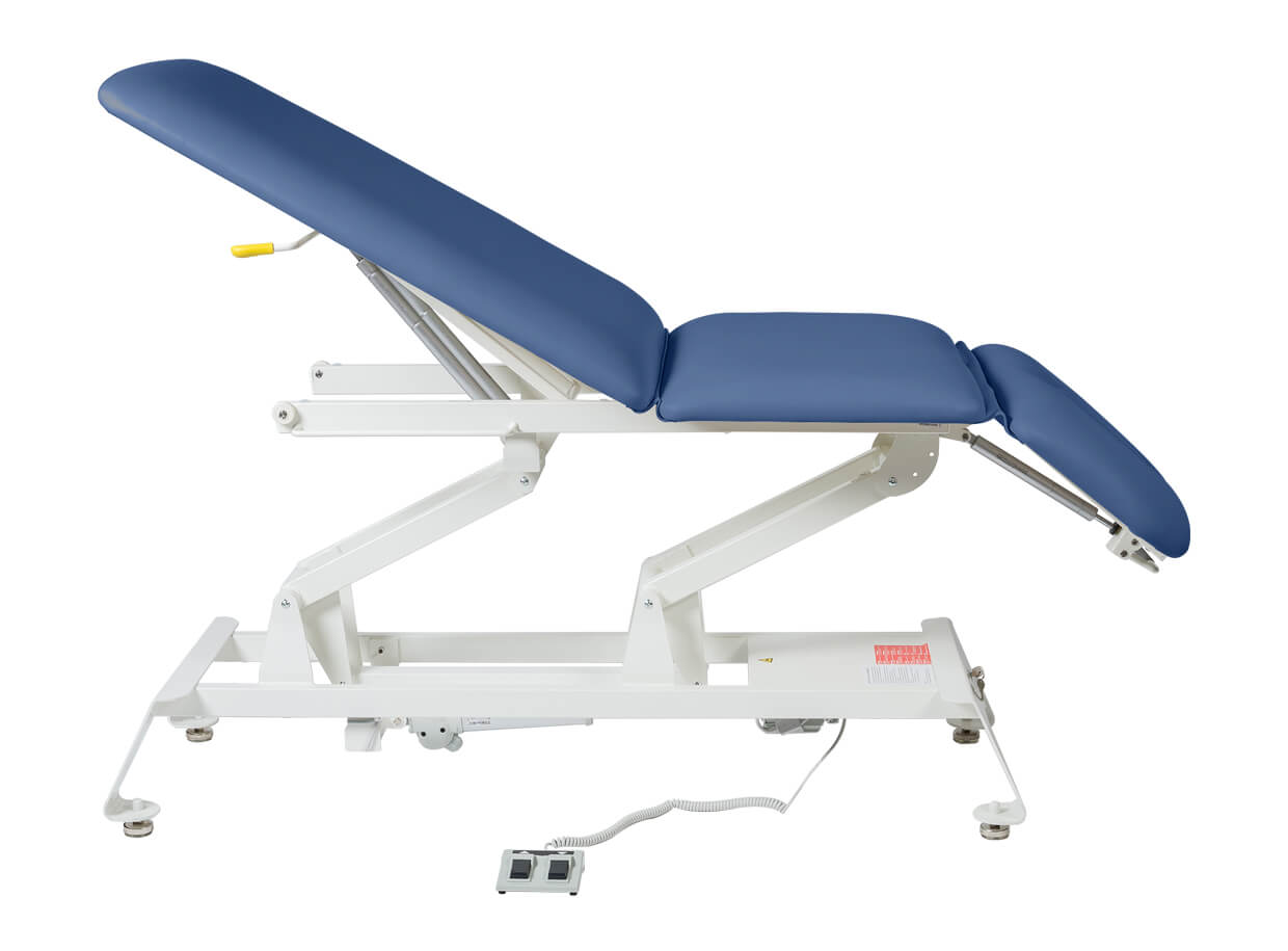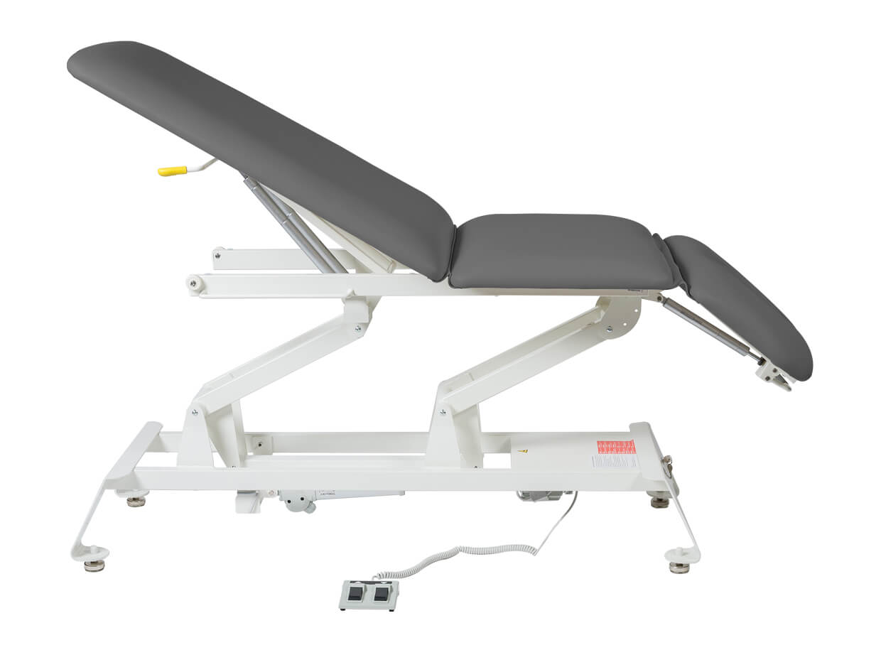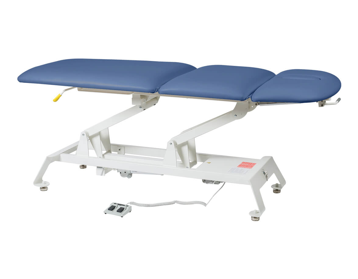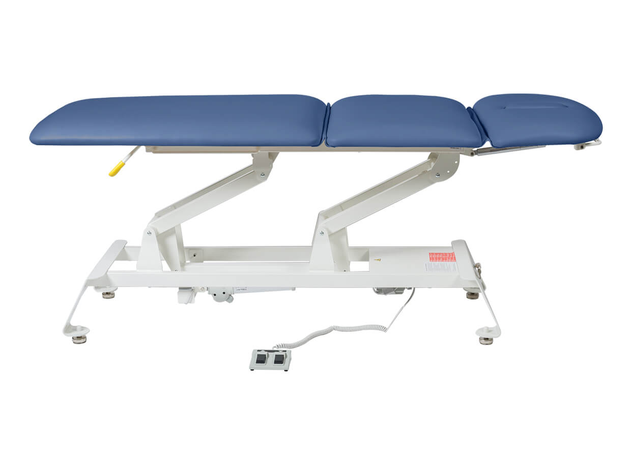 Három részes elektromos ágy állítható fej- és lábtámlával. Használható masszőr vagy kozmetikus szalonban, gyógytornásznál vagy orvosi rendelőben vizsgáló ágyként.
