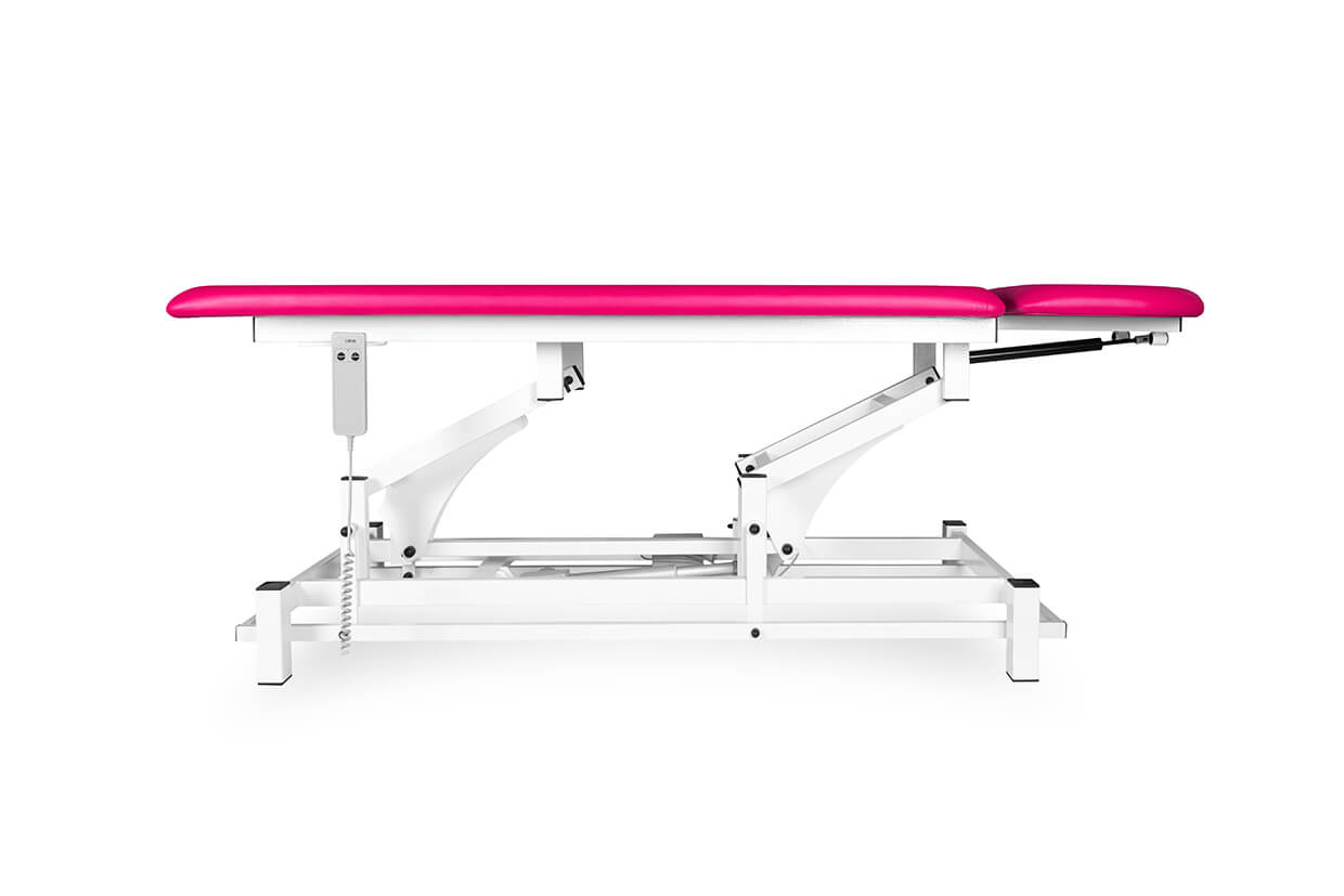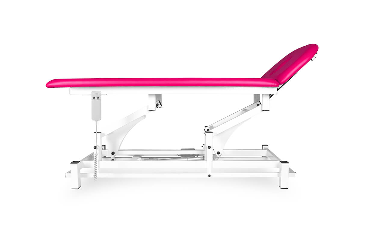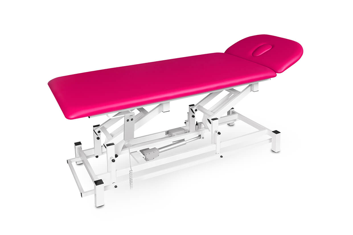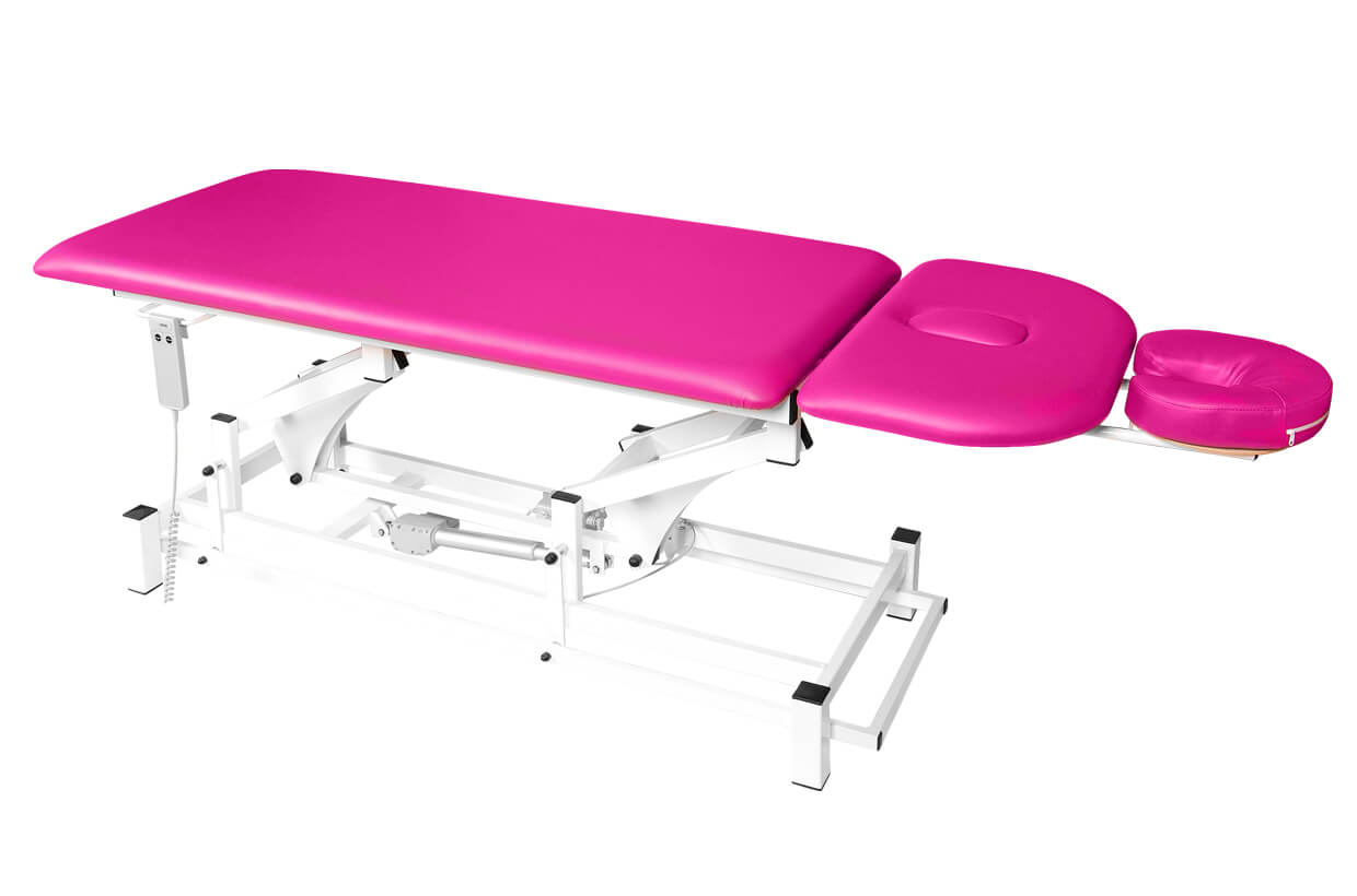 Professzionális kétrészes, elektromosan állítható masszázságy, megbízható és csendes motorral, masszőrök és gyógytornászok számára alkalmas, 200 kg-os teherbíró képességgel és magasság beállítással. Az ágy kényelmesen kárpitozott 4 cm vastag molitán habbal és kiváló minőségű, könnyen tisztítható műbőrrel, valamint állítható csúszásgátlóval ellátott lábakkal. Az ágy felső része gázteleszkóp segítségével dönthető. A masszázságy ára tartalmazza a kézi vezérlést.