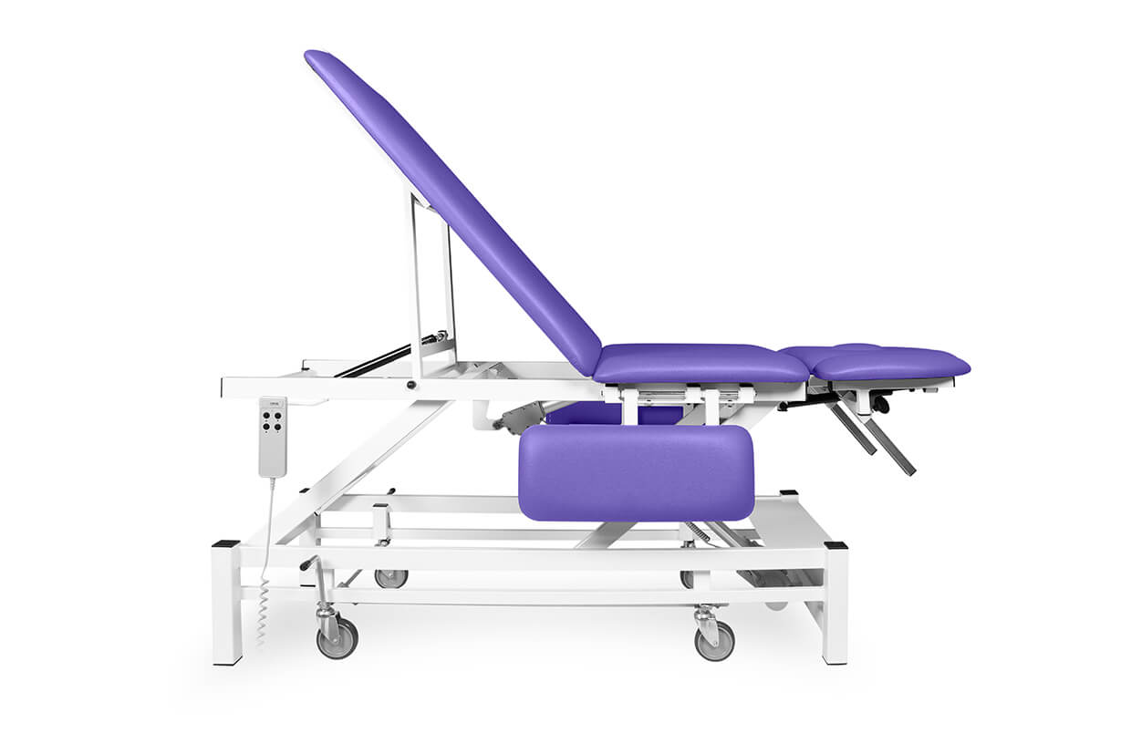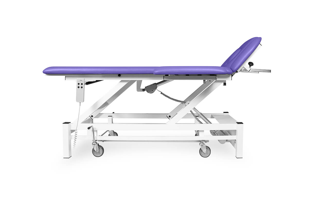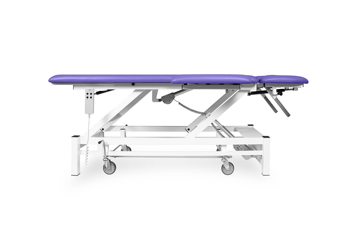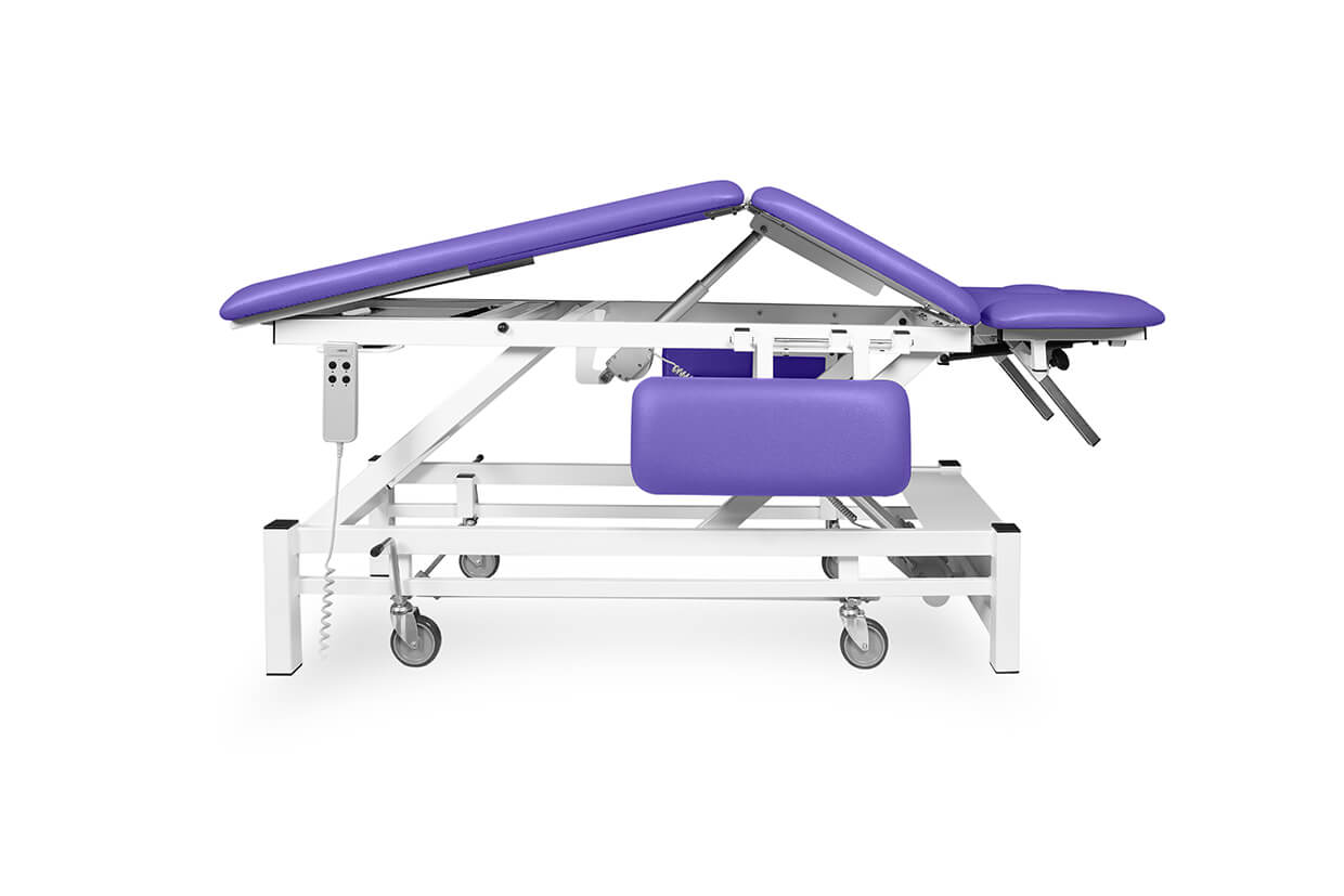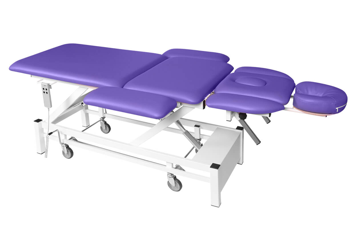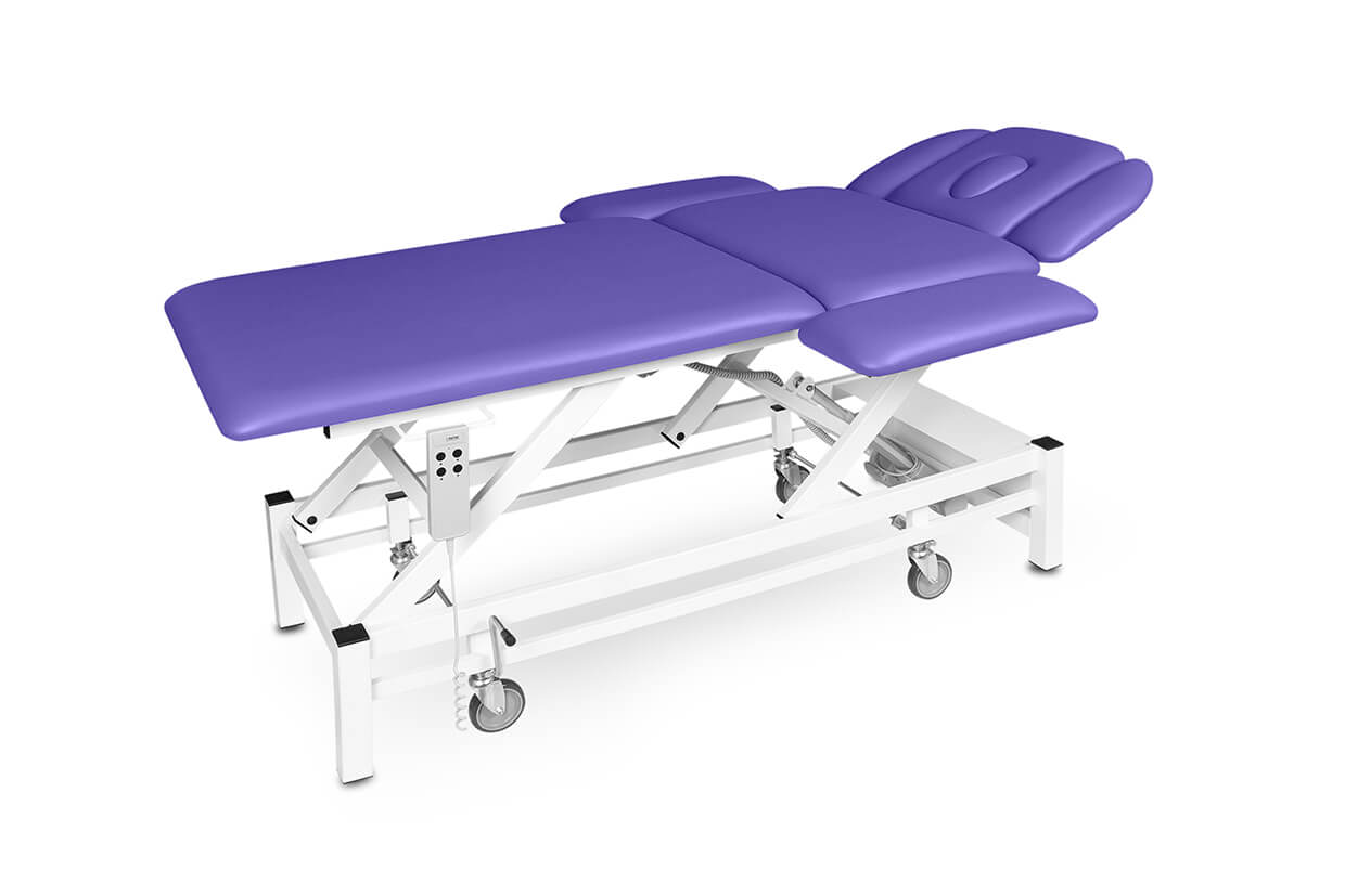 Professzionális háromrészes, elektromosan állítható masszázságy, megbízható és csendes motorral, alkalmas masszőrök és gyógytornászok számára. Az ágy 4 cm vastag molitánhabbal és kiváló minőségű, könnyen tisztítható műbőrrel kárpitozott, valamint állítható csúszásgátló lábakkal van felszerelve. Az ágy felső és alsó része (V emelés) a gázteleszkópnak köszönhetően könnyen a megfelelő pozícióba állítható. A masszázságy ára tartalmazza a kézi vezérlést.