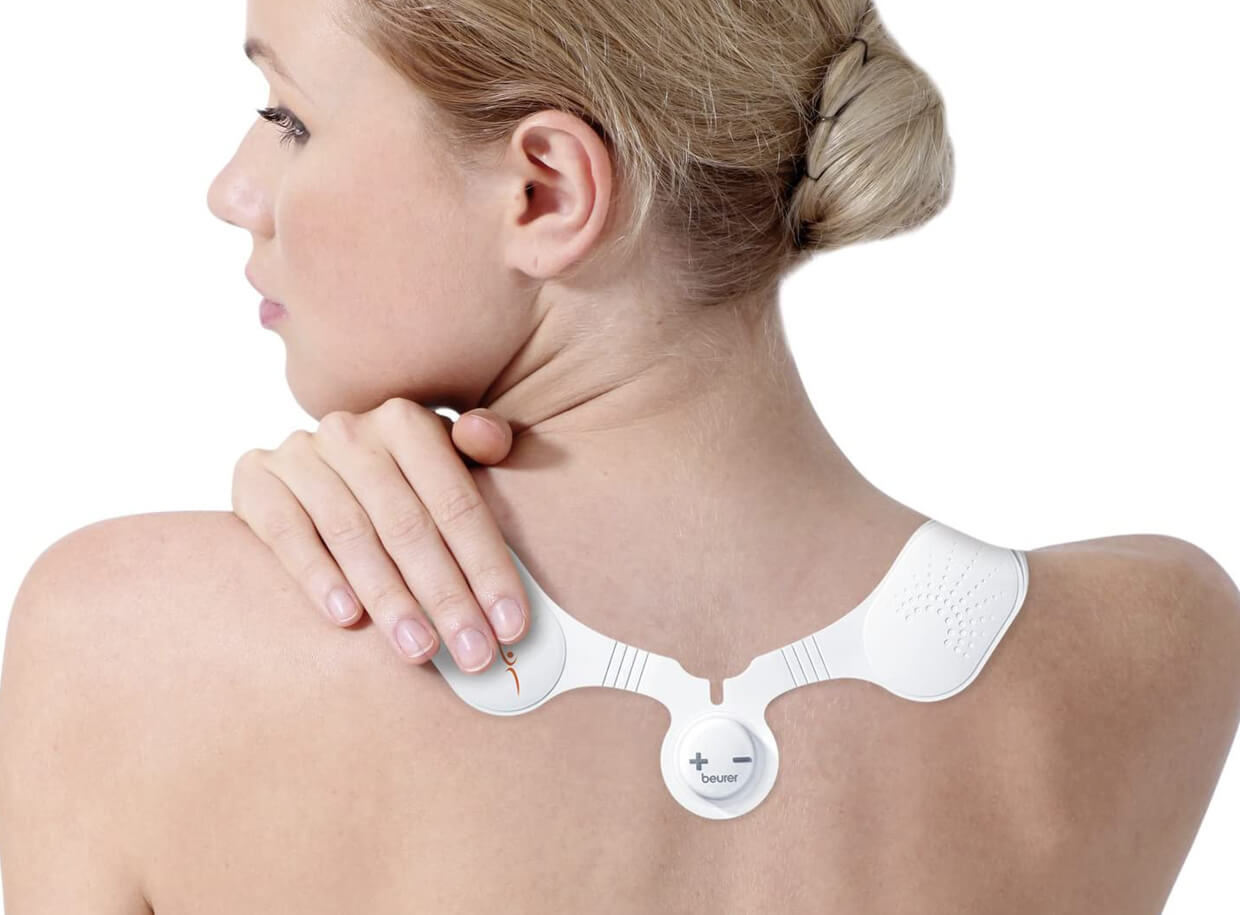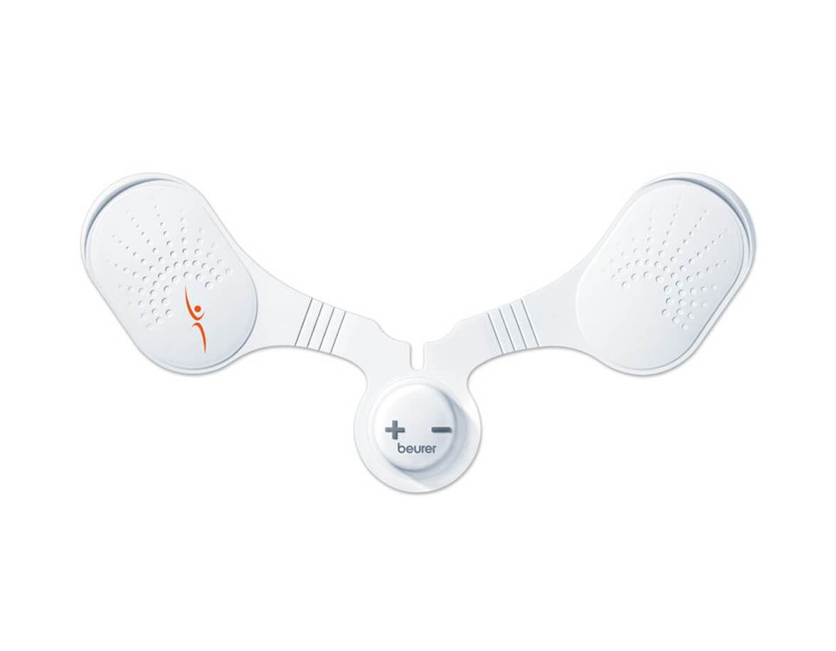 BEURER EM 20 elektrostimulátor a nyak, váll és hát izmainak erősítésére és regenerálására. A készülék vékony szilikonból készült, ergonomikus formájú és az öntapadó gél tapaszoknak köszönhetően erősen tapad a bőrre.