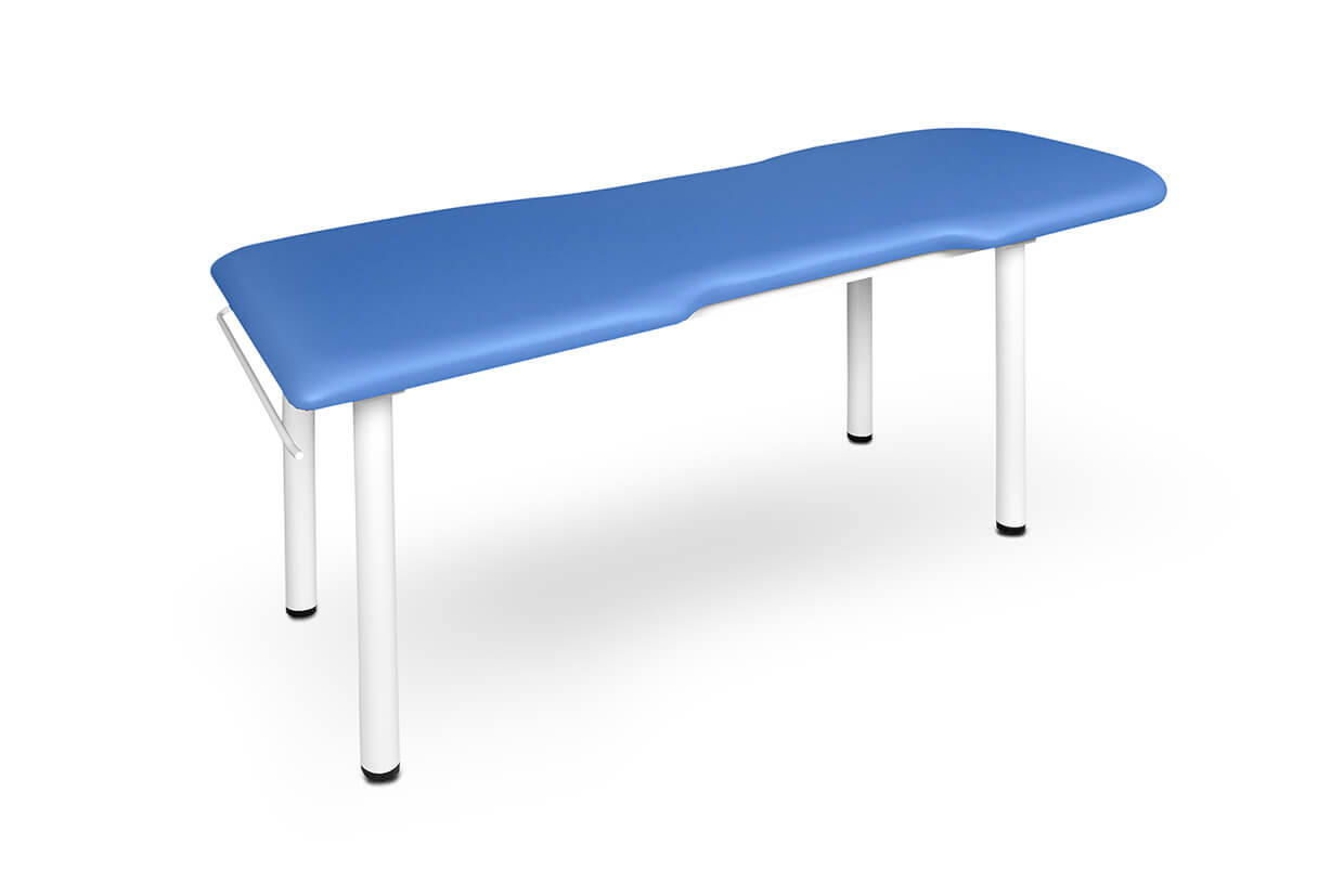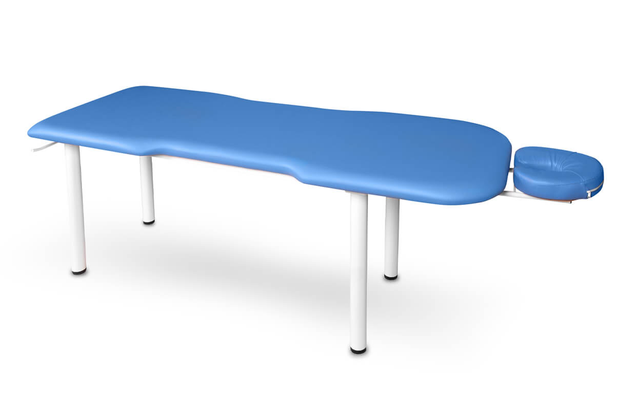 Stabil és kényelmes, egyrészes fizioterápiás- és masszázságy fix magassággal. Az ágy kényelmesen kárpitozott 4 cm vastag molitán habbal és kiváló minőségű, könnyen tisztítható műbőrrel, valamint állítható magasságú csúszásgátlóval ellátott lábakkal és egy 50 cm-es lepedő tartóval.