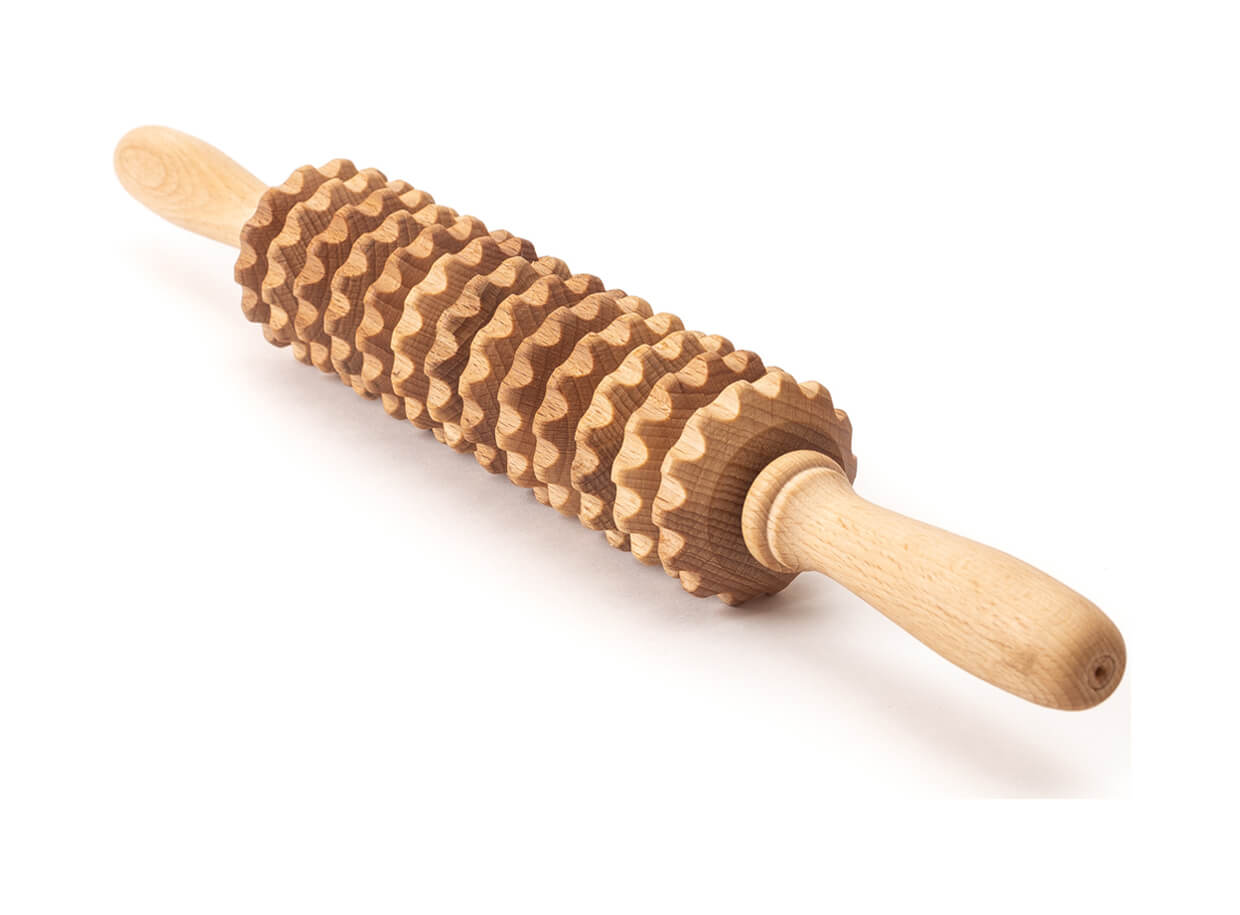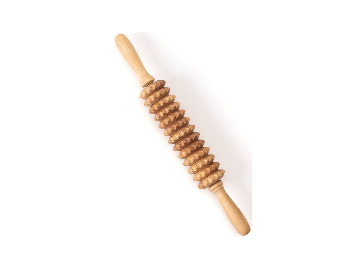 13 db bükkfa fogaskorongból álló masszírozó henger. A formázott fogantyúk kényelmesen illeszkednek a tenyérbe. A henger alkalmas nagyobb felületek masszírozására a problémás testrészeken, narancsbőr, vastagabb bőr alatti zsírréteg vagy megereszkedett bőr esetében.