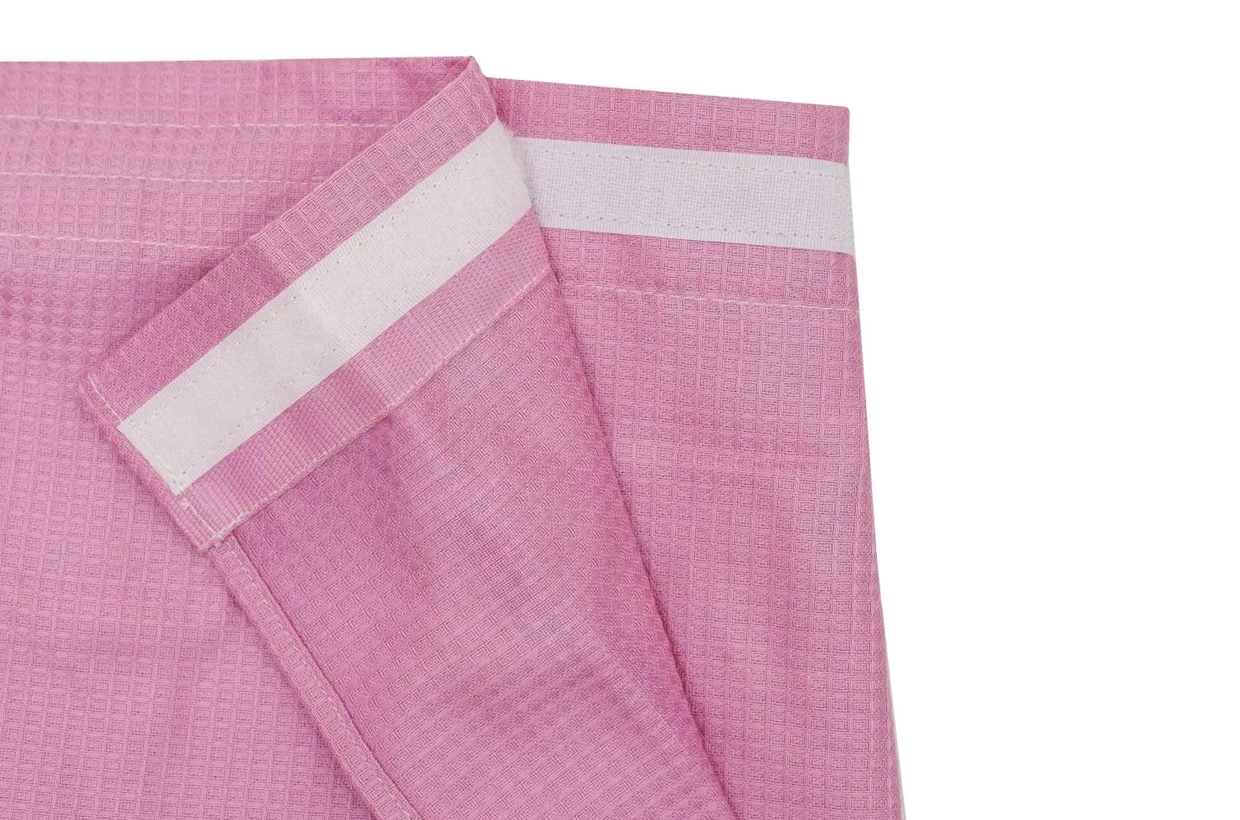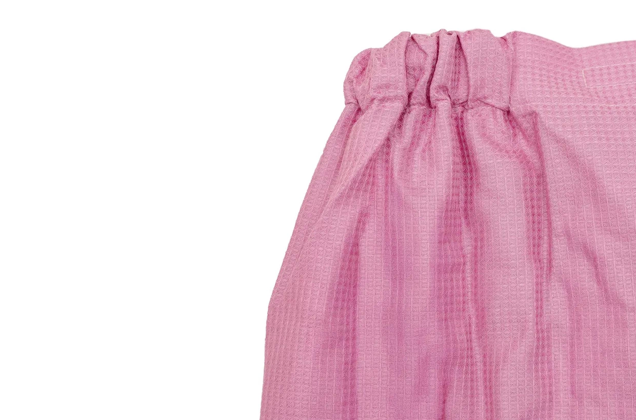 Könnyű szauna kilt hölgyek számára halvány rózsaszín színben, 100% pamutból készült, kockás (wafle) kidolgozással. Az anyag ezáltal szerkezetet kap, nem átlátszó marad, mégis könnyű és szellős.