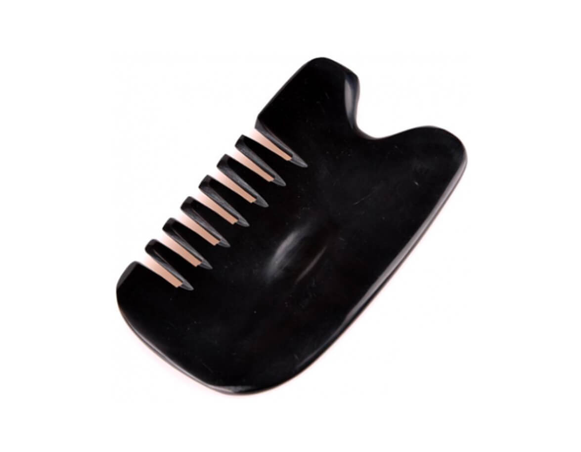 Bivalyszarvból kézzel készített guasha fésű a fej, az arc és a test masszírozására. Segíti a haj növekedését, támogatja a vérkeringést és a nyirokrendszert.