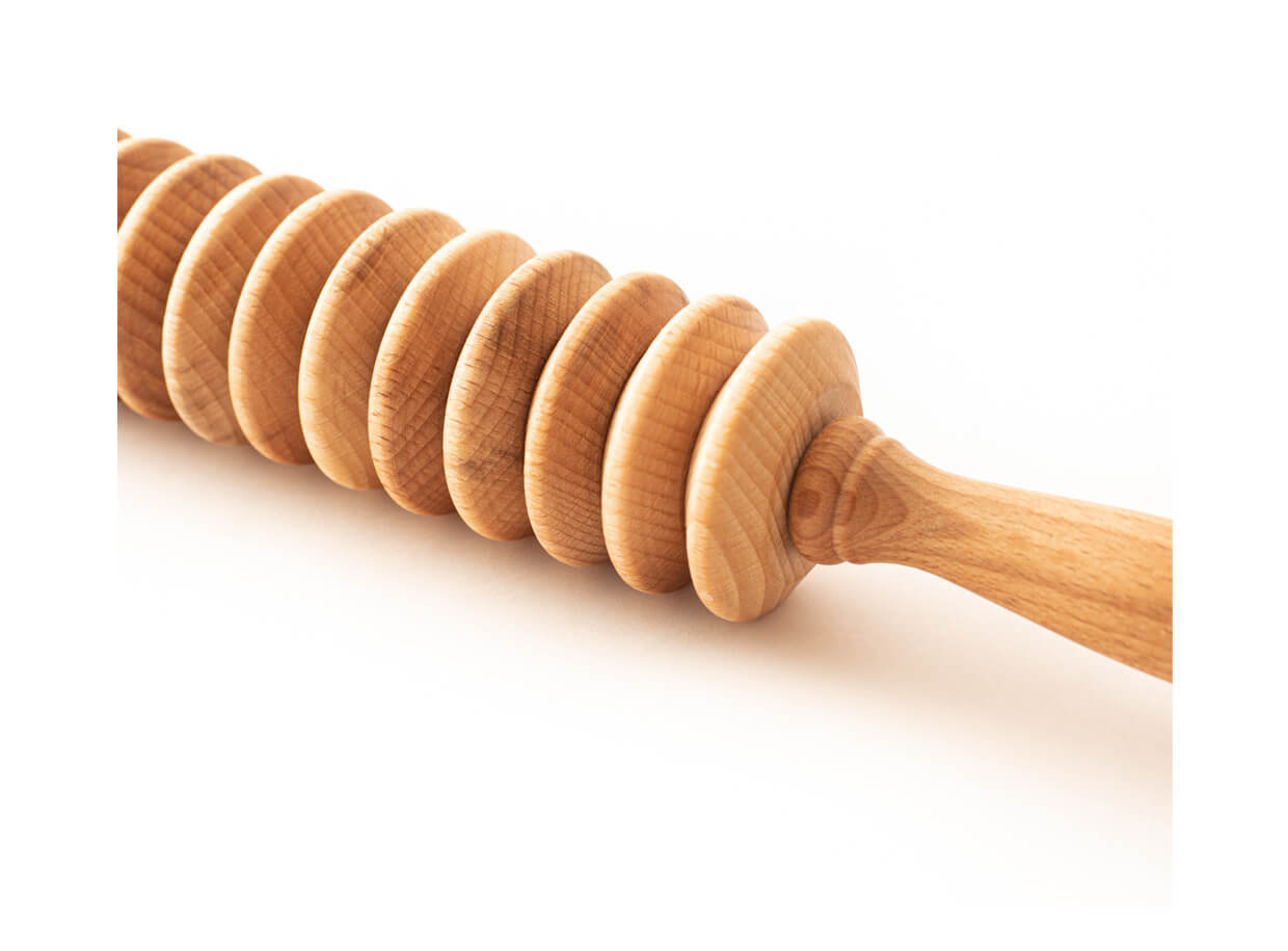A masszázshenger 13 bükkfából készült korongból áll. A formázott fogantyúk kényelmesen illeszkednek a tenyérbe. A henger alkalmas a problémás testrészek masszázskezelésére narancsbőr, vastagabb bőr alatti zsírréteg és megereszkedett bőr esetében.