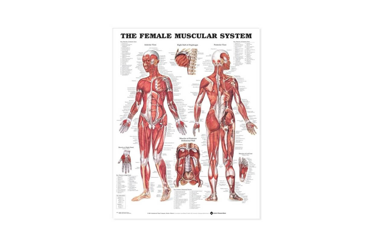 Ez a plakát az izomrétegek részletes leírását tartalmazza, a hasüreg a mell, hát, nyak és a végtagok izmait. Tartalmazza a belső izmok mintáját a gerinc derék táji részén.
