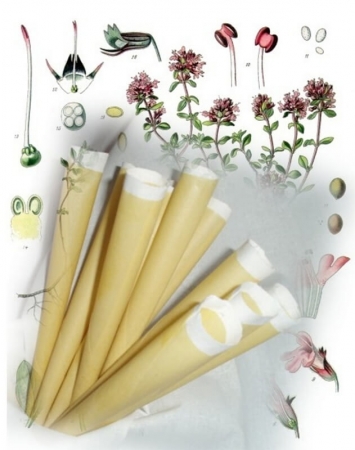 A testgyertya anyaga pamutból van, amely teljes mértékben át van itatva méhviasszal és 100% illóolajjal.