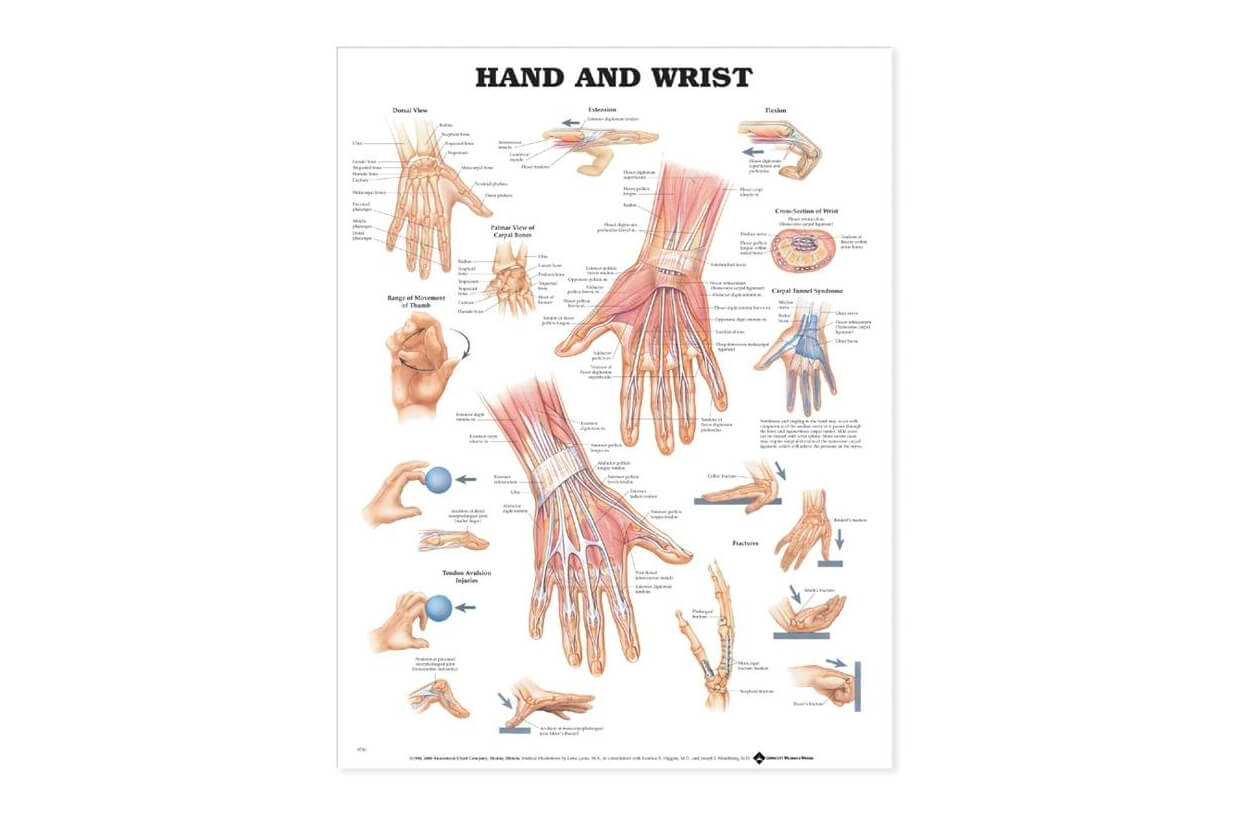 Az egészséges csukló és kéz izmainak, ínjainak a dorzális és palmáris nézete egy nagyobb képen, kisebb ábrákkal kiegészítve, a csontok áttekintésével, hüvelykujj, ujj és a csukló mozgásával és a kiválasztott betegségek és sérülések (különböző típusú törések) illusztrált áttekintésével.