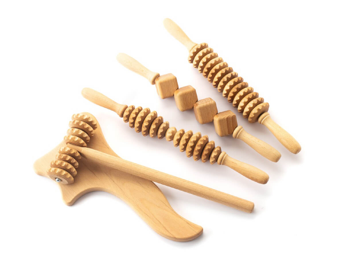 A közepes méretű készlet maderoterápiához 5 különböző bükkfából készült eszközt tartalmaz.