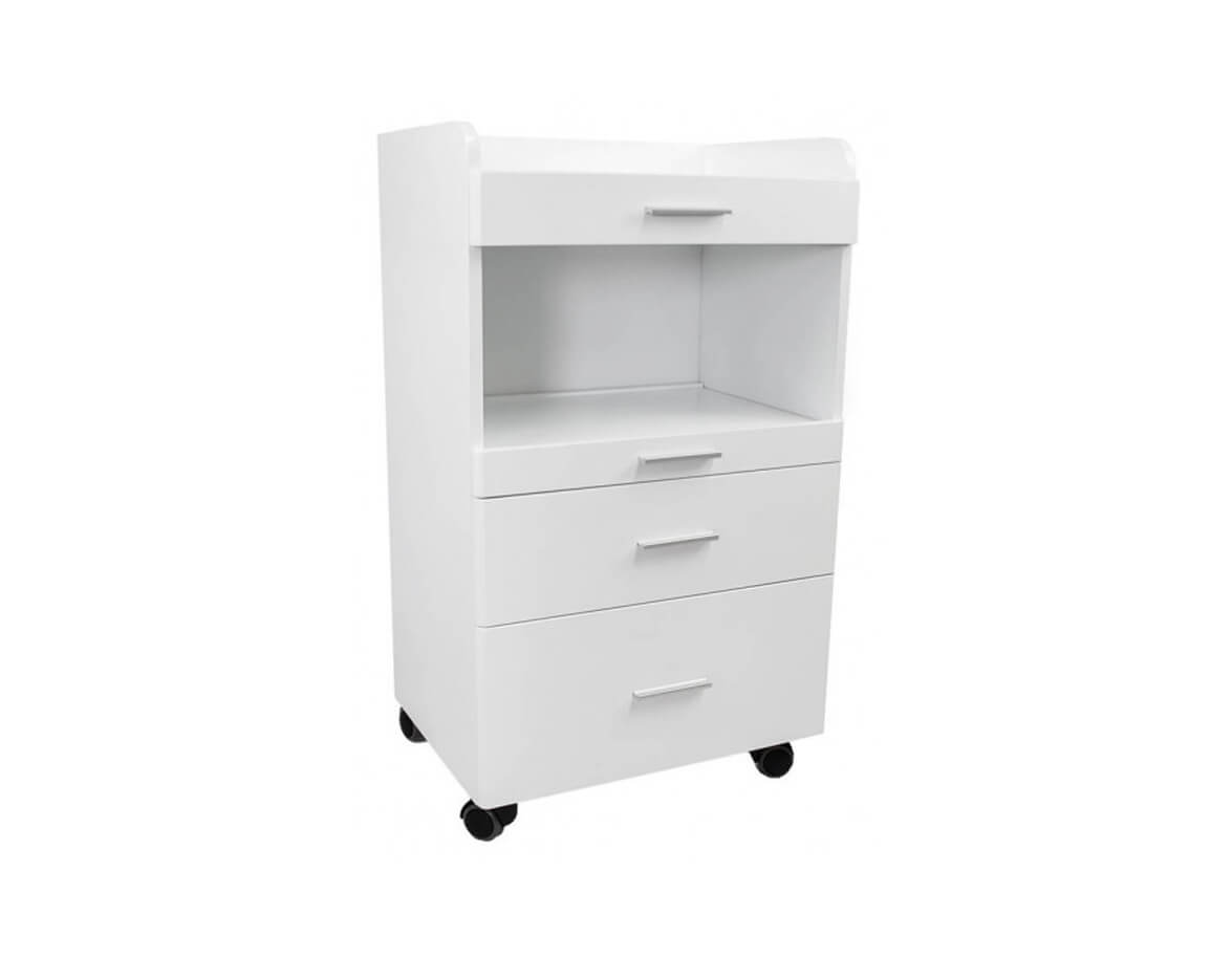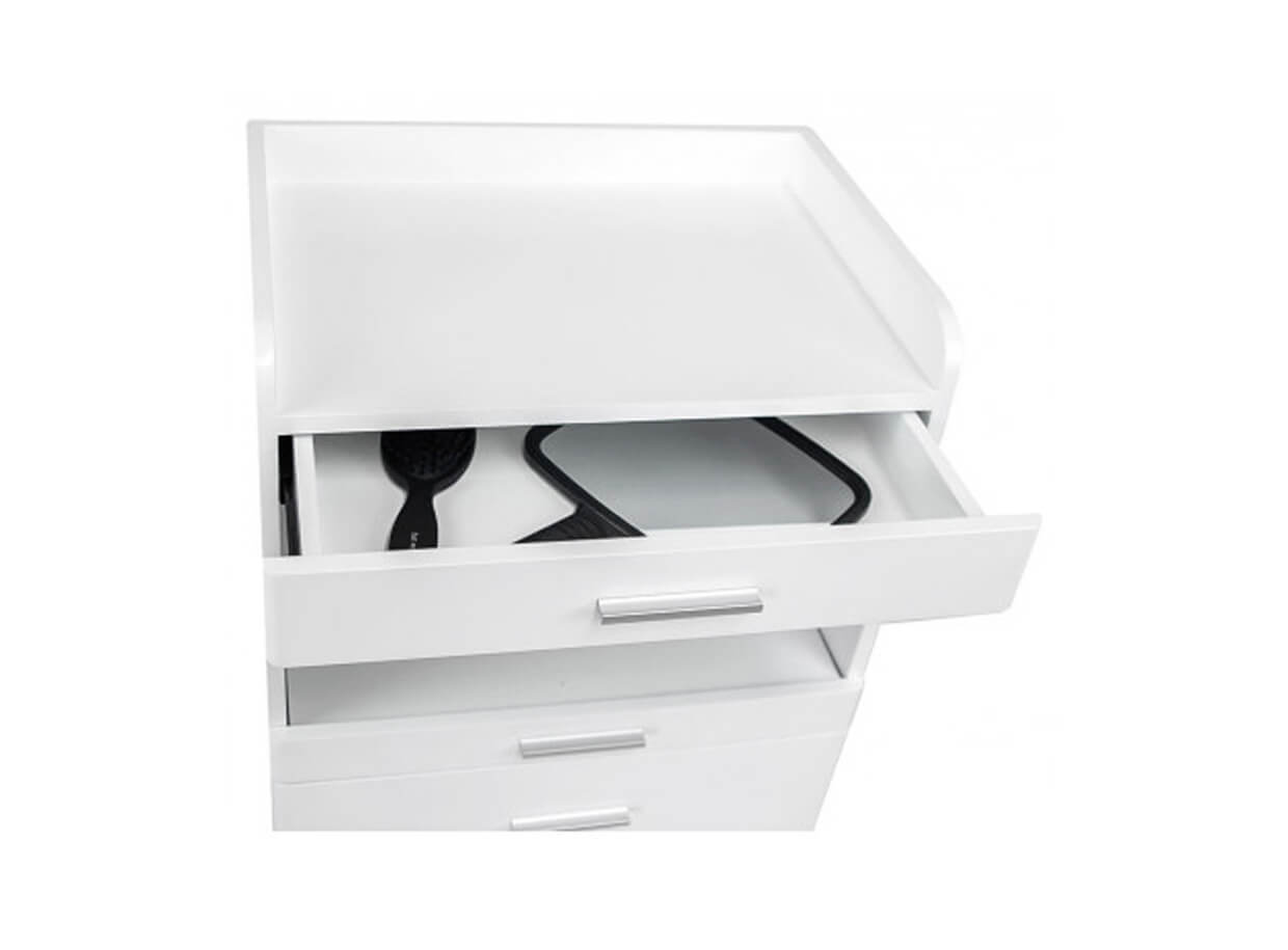 Funkcionális FANCY kozmetikai asztal fehérre lakkozott forgácslapból, kerekekkel ellátva a kényelmes áthelyezés érdekében. Tárolóhellyel rendelkezik, három különböző méretű fiókkal a segédeszközök tárolására.