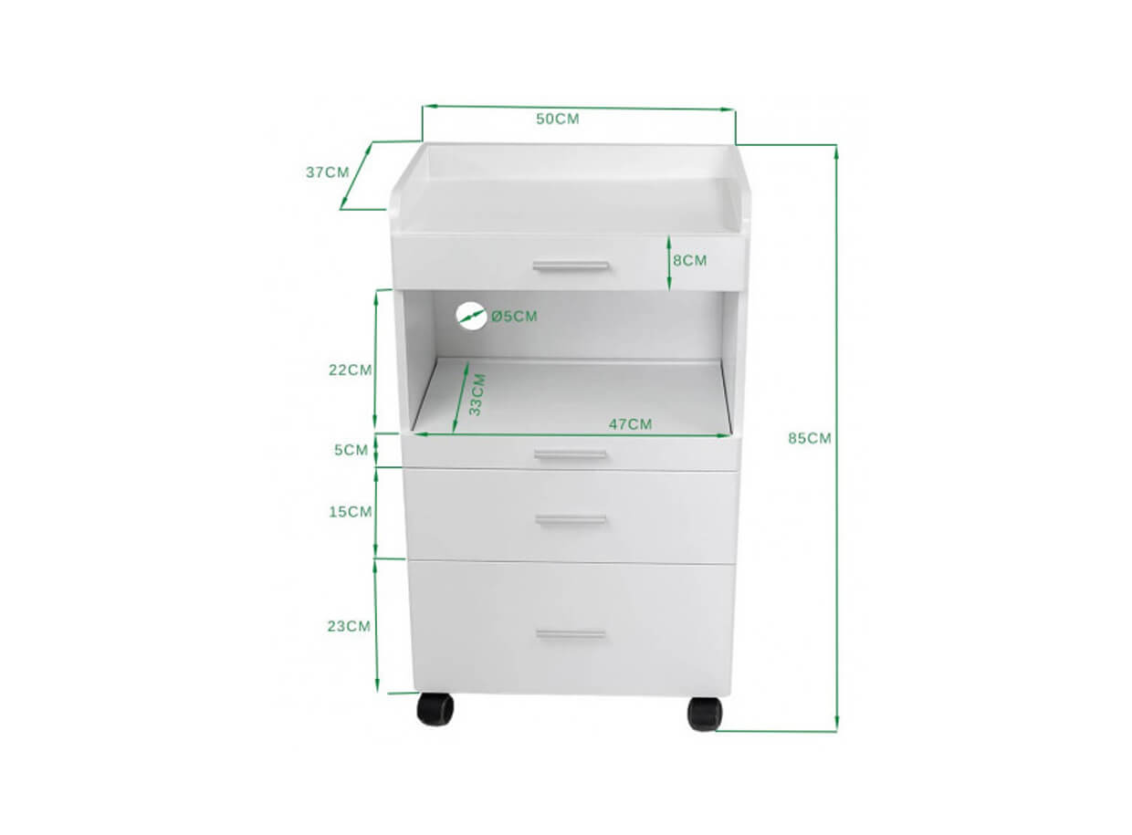 A hátsó falon található nyílás a kozmetikai eszközök vagy sterilizálókhoz tartozó kábelek számára. Minden szépségszalonba, masszázs- és fizioterápiás szalonba alkalmas.