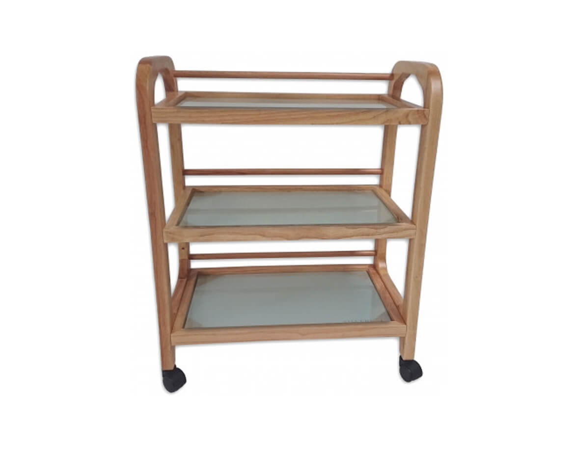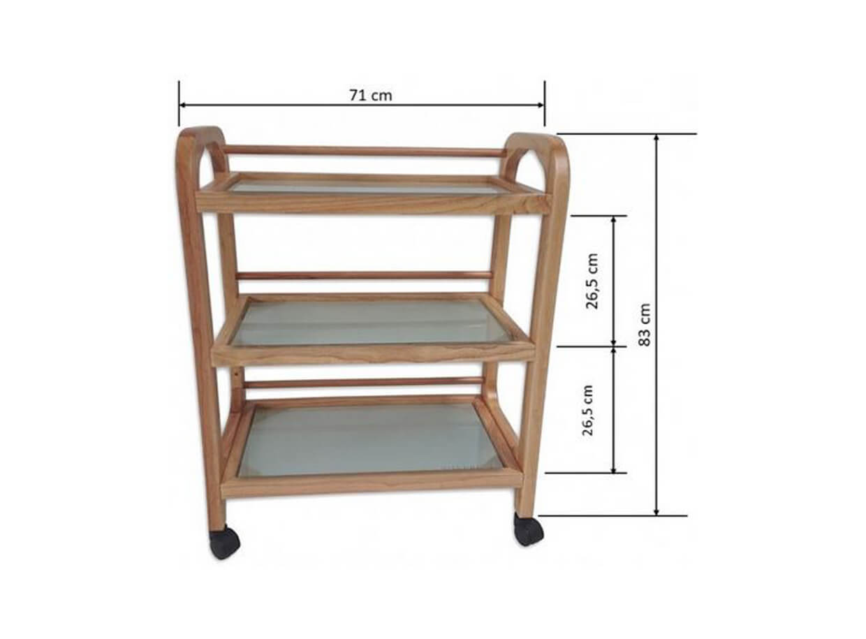 A három keményített tejüvegből készült polccal ellátott lekerekített fakonstrukciót praktikus kerekek egészítik ki. Minden szinten hátul elhelyezett rúd található, hogy a kellékek ne essenek le a polcokról az asztal mozgása közben.