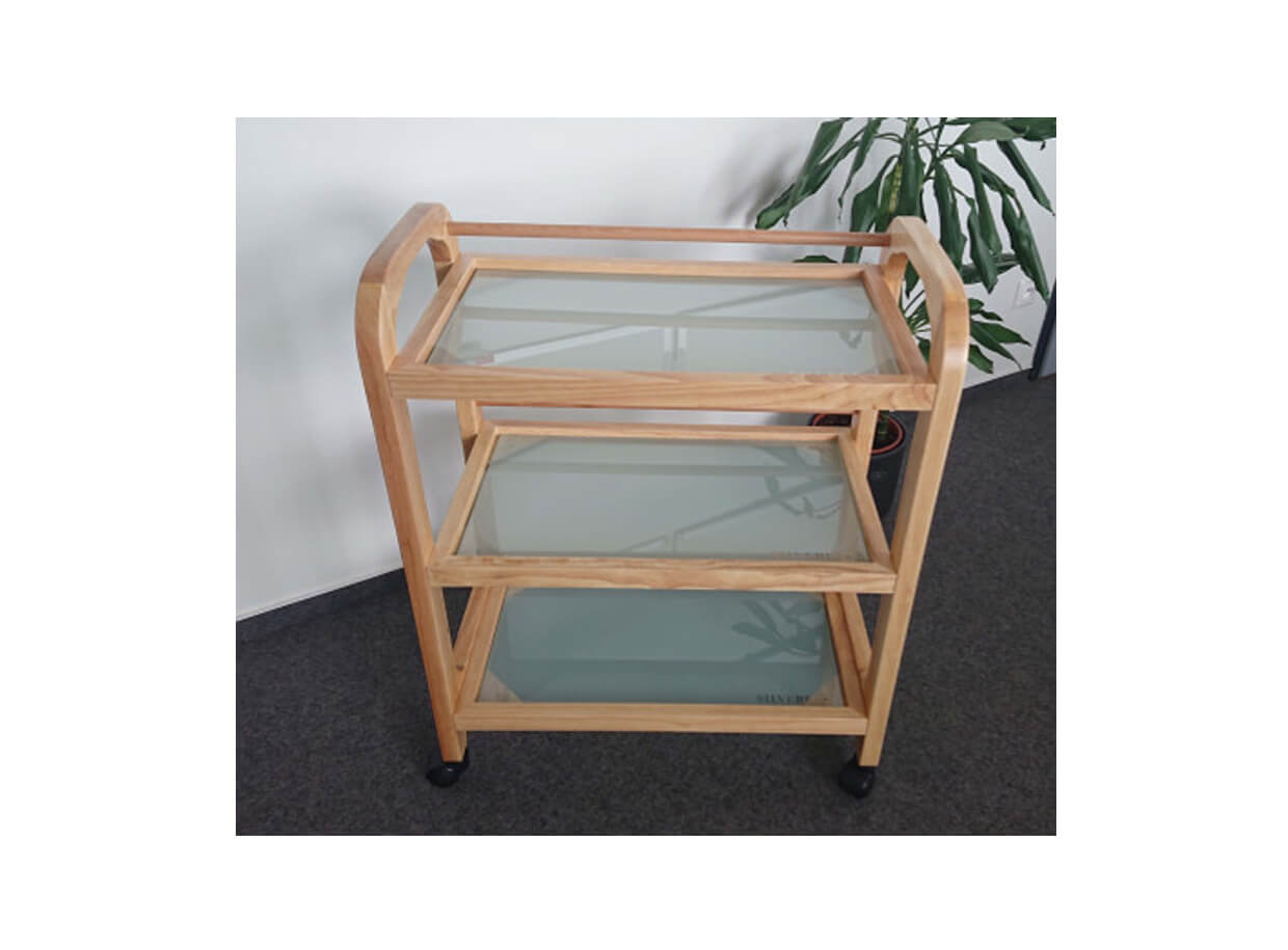 Fából készült kozmetikai asztal üvegpolcokkal és kerekekkel.