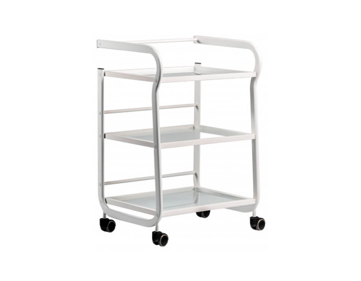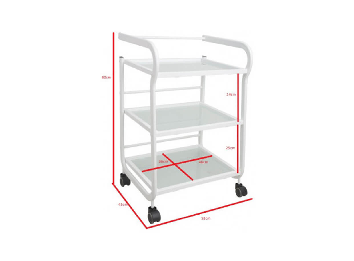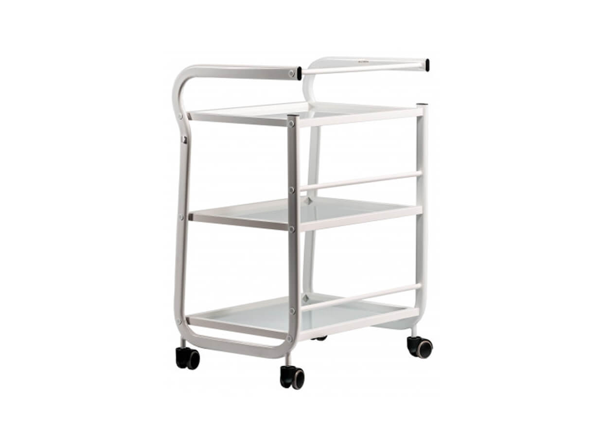 Elegáns asztal Vision fémszerkezettel és nyitott üvegpolcokkal. A kocsi teljesen mobil és könnyen mozgatható. A polcok méretei helyet biztosítanak masszázs segédeszközök, lávakövek, köpölyök, illetve szalagok tárolására.