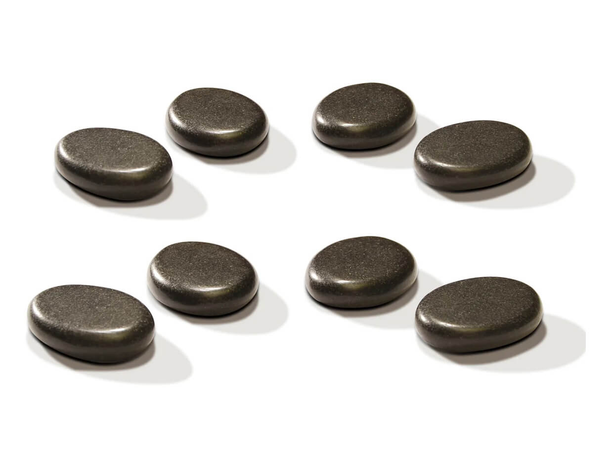 A kövek kézzel csiszoltak és 100% bazaltból készültek, amely gyorsan felszívja és hosszú ideig megtartja a hőt. Ovális formájúak, sima felületűek, lekerekített élekkel, aminek köszönhetően kényelmesen elhelyezhetők a lábujjak között.