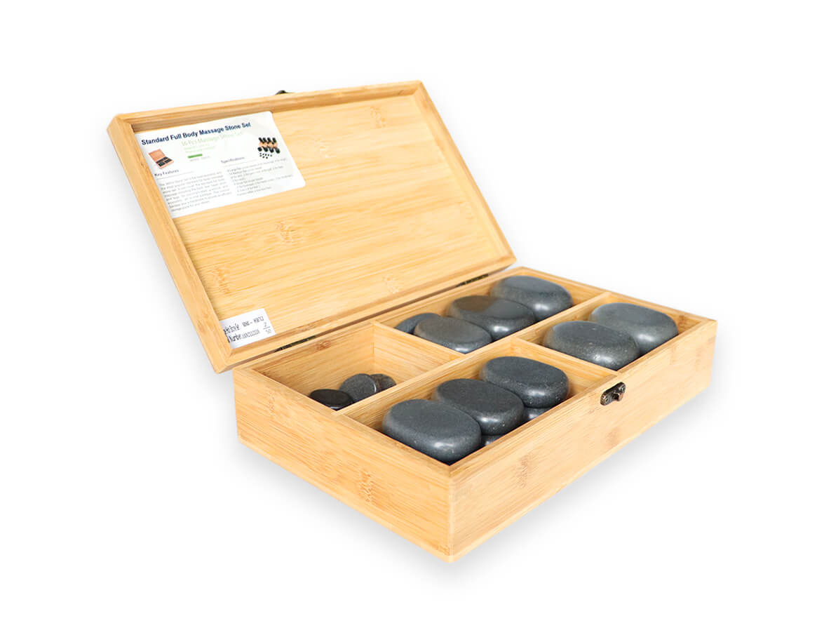 36 darabos masszázs lávaköves készlet bambusz dobozban. A masszázskövek különböző mérete illeszkedik a test különböző részeihez. A kövek kézzel készítettek bazaltból, lávakőből, amely gyorsan felmelegszik és hosszú ideig megtartja a hőt. Hagyományos módszerrel csiszolják, viasz, színezék vagy vegyszer hozzáadása nélkül. Simák és alaposan csizsoltak, így könnyen siklanak a bőrön.
