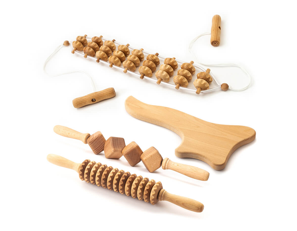 A készlet 4 különböző bükkfából készült maderoterápiás eszközt tartalmaz. Alkalmas önmasszázsra vagy otthoni használatra, de megfelelő professzionális szalonba is.
