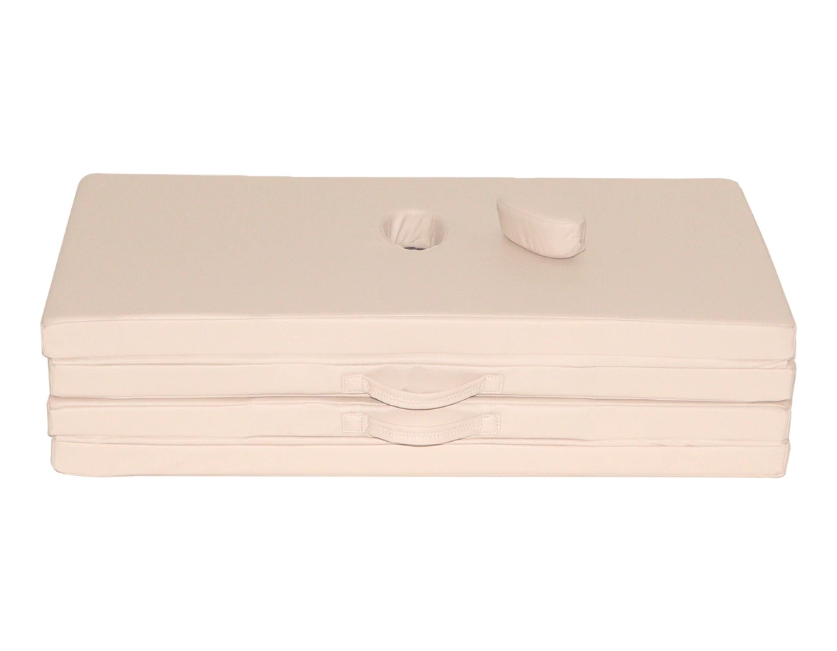 Az oldalán két bevarrt hurok megkönnyíti a szállítást. Az alátéthez táska is tartozik, amelyet különösen a mobil masszőrök és gyógytornászok értékelni fognak. A felső részén dugóval ellátott arcnyílás található.