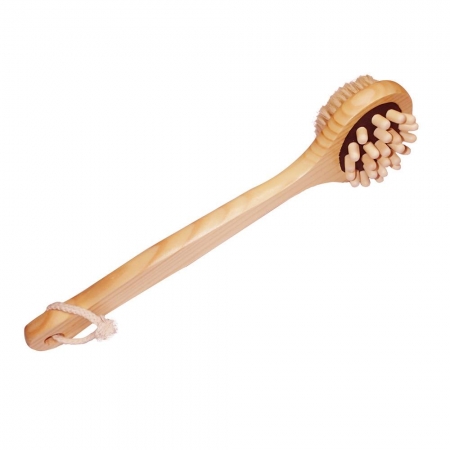 Kefe a test megmosására – teljes fa - hosszú fogóval ellátva. Az ovális rész egyik oldalán természetes sörték vannak, a másik oldalon pedig masszírozó részek, amelyek gumi alátétbe vannak behelyezve. Ideális a comb problémás területeinek az átmasszírozására.