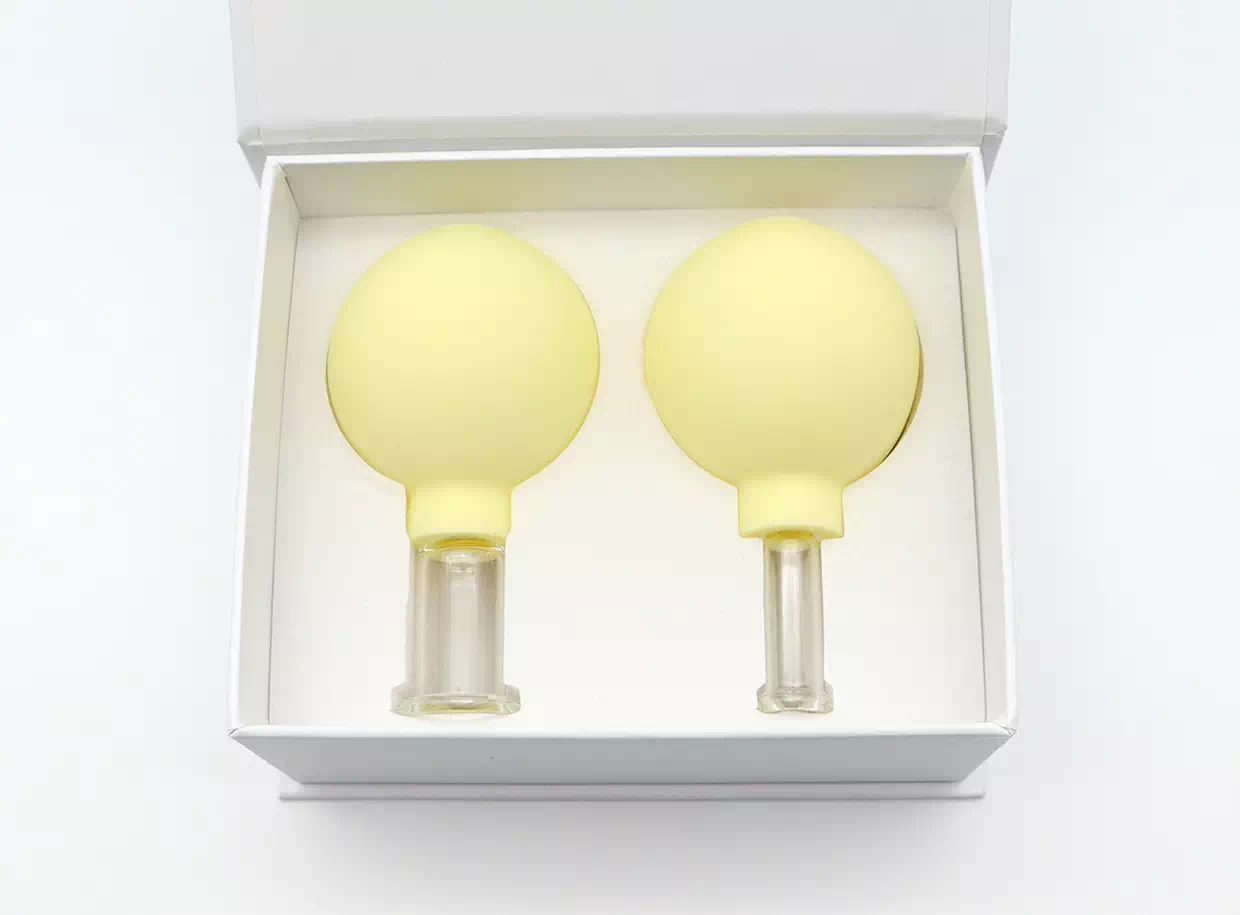 A készlet két gumi ballonnal ellátott köpölyt tartalmaz, amelyek alkalmasak az arc, a nyak, az orca és a dekoltázs masszírozására. A köpölyöket nem kell felmelegíteni az eljárás előtt, ami nagyban megkönnyíti a masszőrök munkáját. Elegendő megnyomni a ballont és a köpölyt a bőrre helyezni.