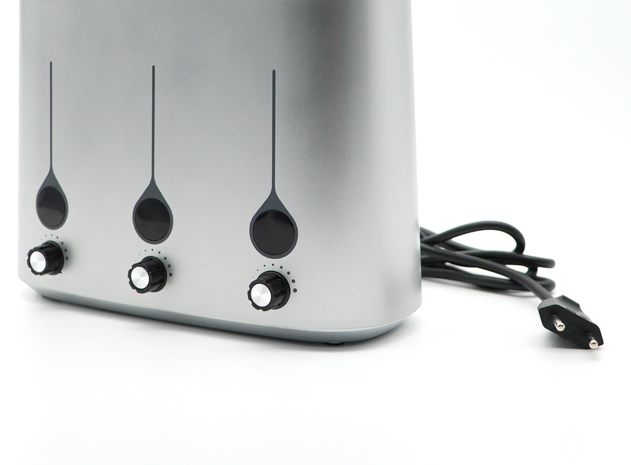 A melegítő tömör ABS műanyagból készült. Modern kialakítású, és olyan biztonsági funkciókkal van felszerelve, amelyek megakadályozzák, hogy olaj csöpögjön a készülék belsejébe és az elektromos alkatrészeibe. Minden bemélyedés alján egy érintkező kapcsoló található, amely aktiválja a palackmelegítés funkciót. 8 óra használat után a készülék automatikusan kikapcsol.
