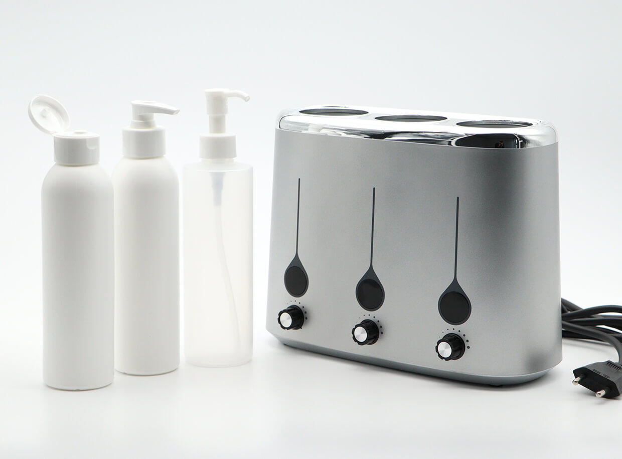 Az egyes palackokhoz egyedi hőmérséklet-beállítással és három adagolópalack-nyílással rendelkező melegítő biztosítja a masszázsolajok, krémek és emulziók felmelegítését és a kiválasztott hőmérséklet fenntartását. A csomag három, 240 ml-es űrtartalmú flakont és egy adagolót tartalmaz a masszírozó szerhez, mely egyszerre melegíthető.
