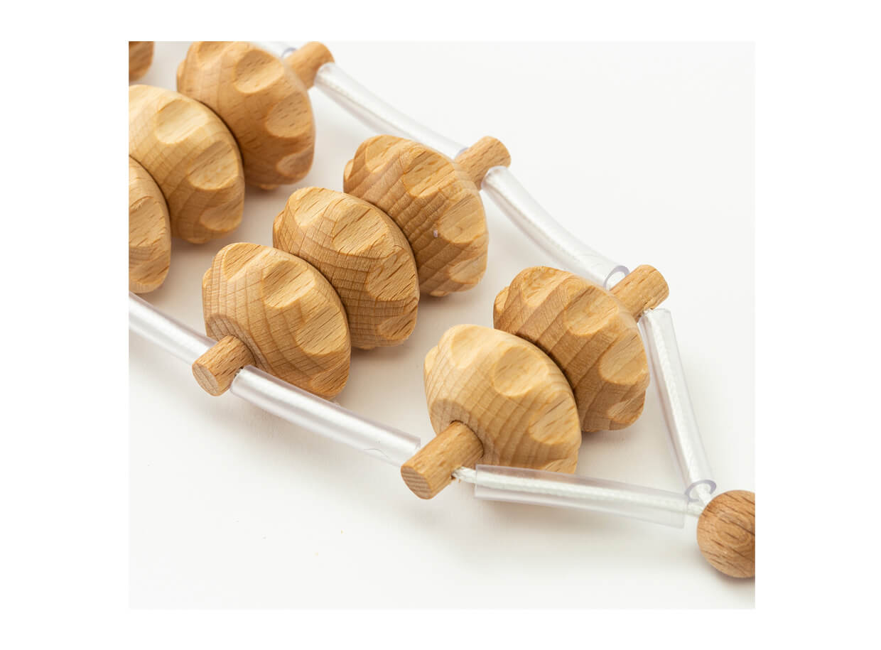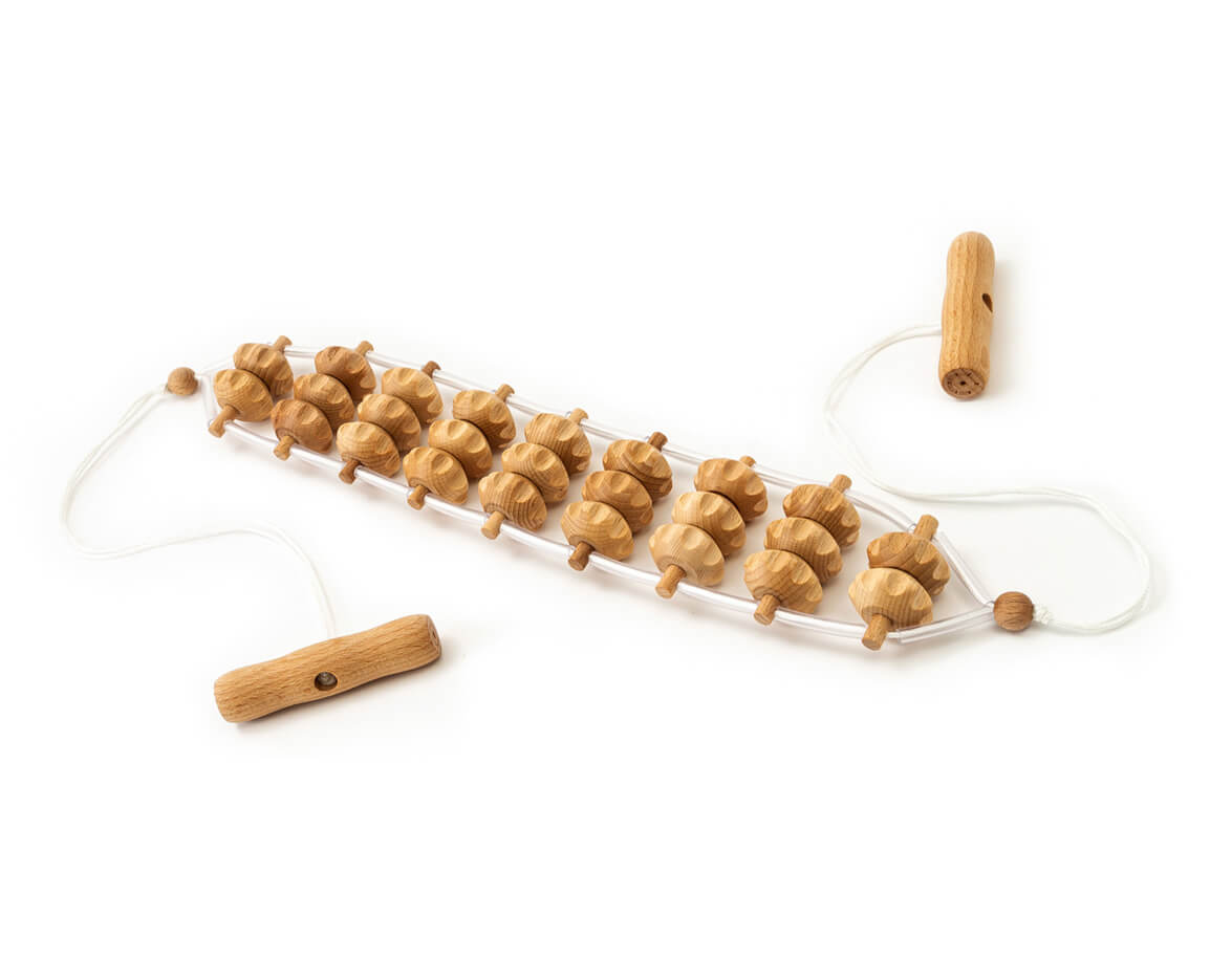 A bükkfából készült masszázsöv 25 formázott masszázshengerből áll. Kiválóan alkalmas a hát, derék, csípő, fenék és a comb önmasszázsára. Professzionális masszázsszalonokban is használható.