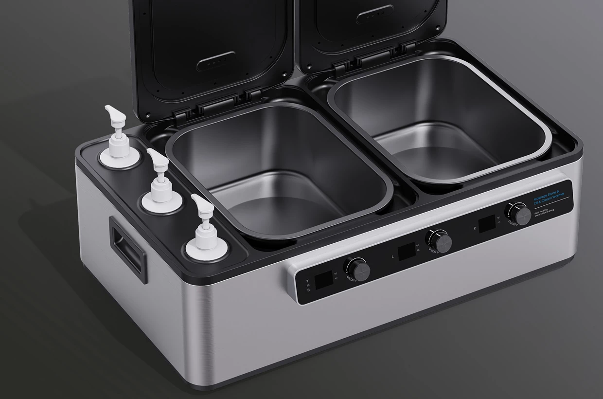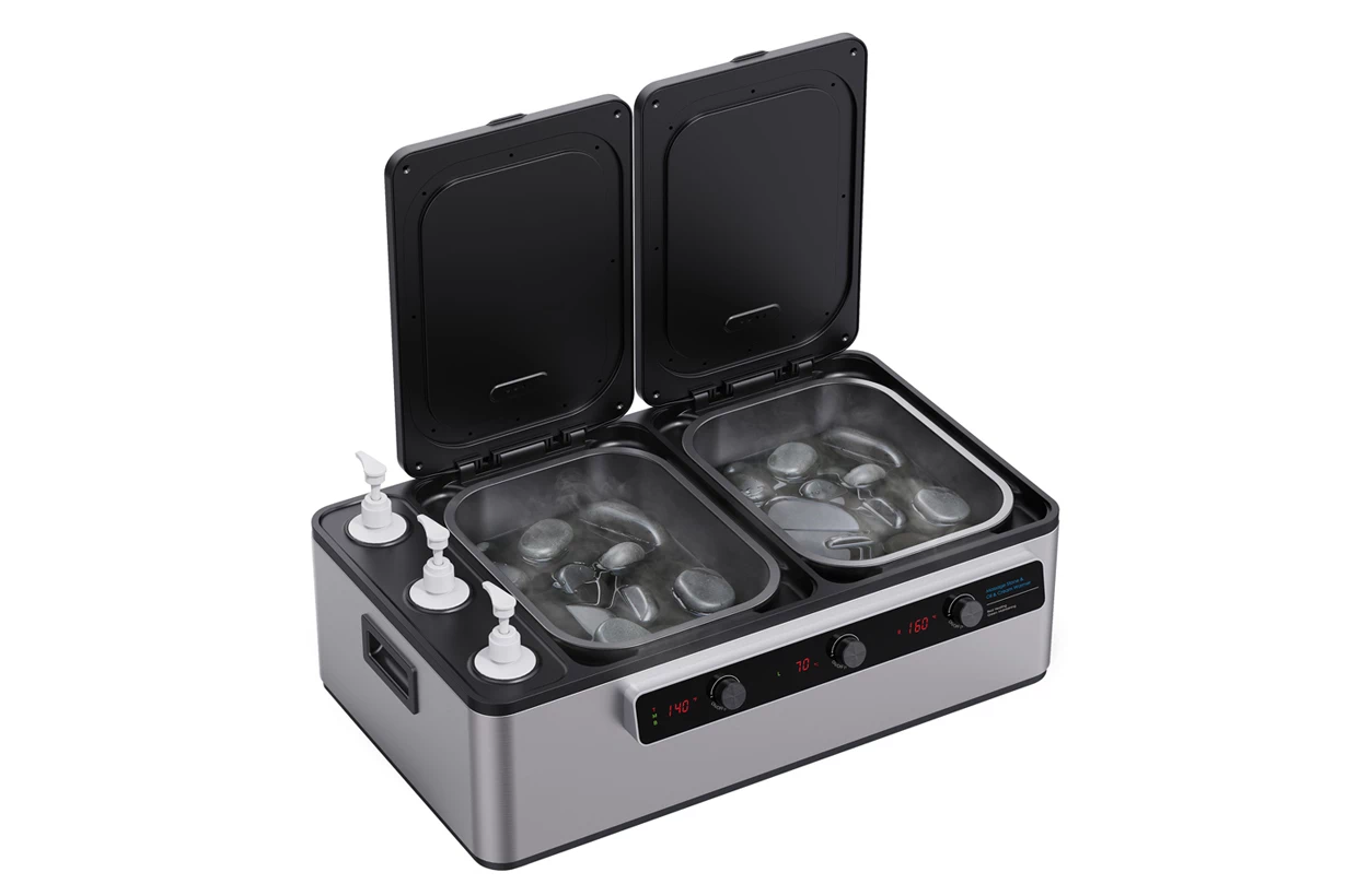 Multifunkciós készülék, amely lehetővé teszi 2 készlet lávakő és akár 3 különböző típusú masszázsolaj egyidejű gyorsfelmelegítését, függetlenül a melegítési hőmérséklet-beállításokktól °C-ban vagy °F-ben mindkét kád esetében a lávakövekre és az olaj melegítését.