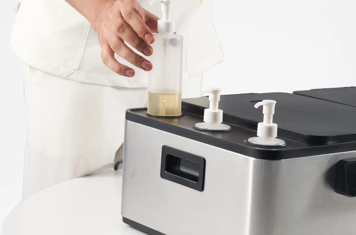 Egymástól független melegítés mindhárom masszázsolaj palackhoz 40-60°C tartományban. A készülékhez három darab 300 ml-es olajflakon tartozik adagolóval. A masszázsolaj ajánlott mennyisége az optimális melegítéshez 200 ml 1 flakonban.