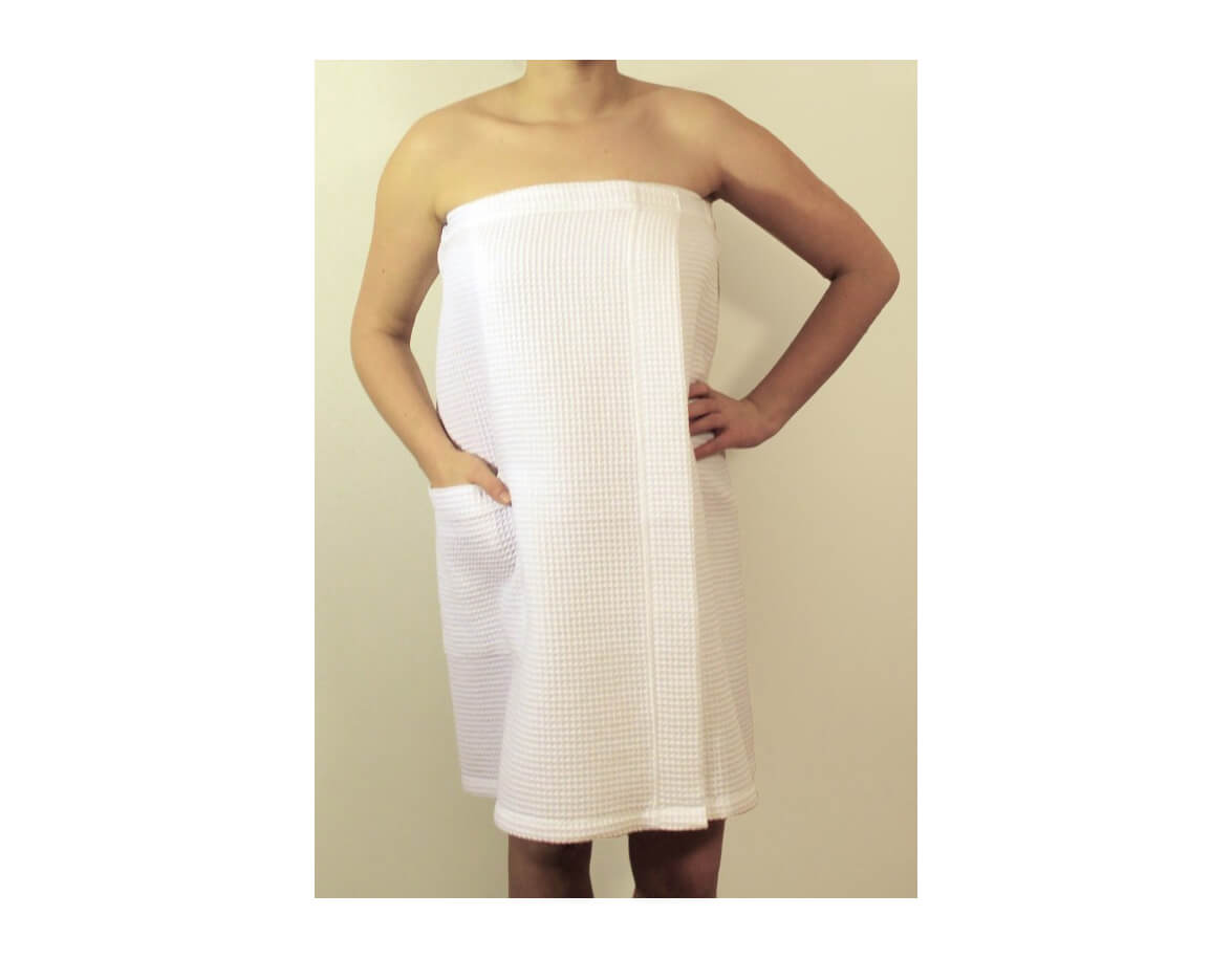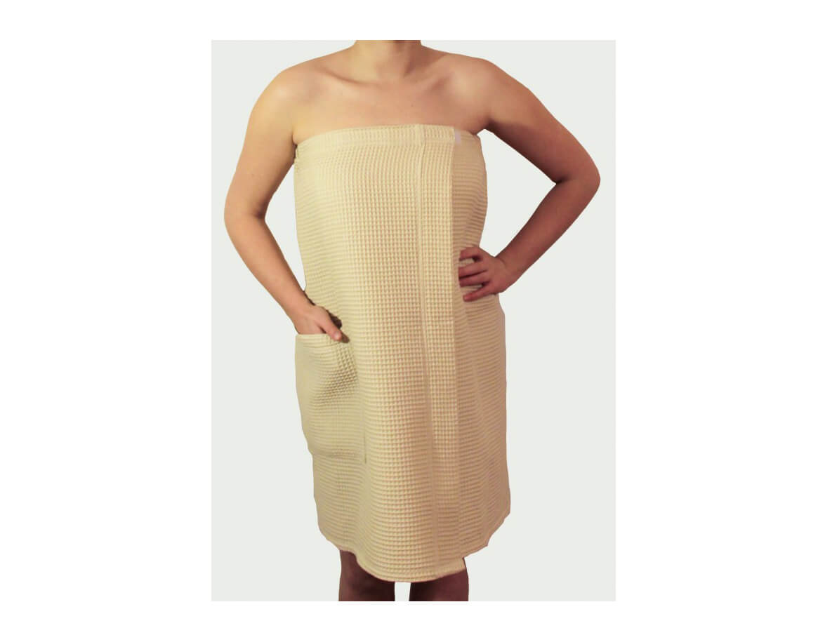 A hölgyek számára készült szaunakilt laza szabású gofrimintás anyagból varrva. A kilt légies anyaga garantálja a könnyedség, természetesség, kényelem érzetét és egyben elegáns megjelenést kölcsönöz. A test nagyobb részét elfedi, magasabb alkatú férfiak is használhatják.