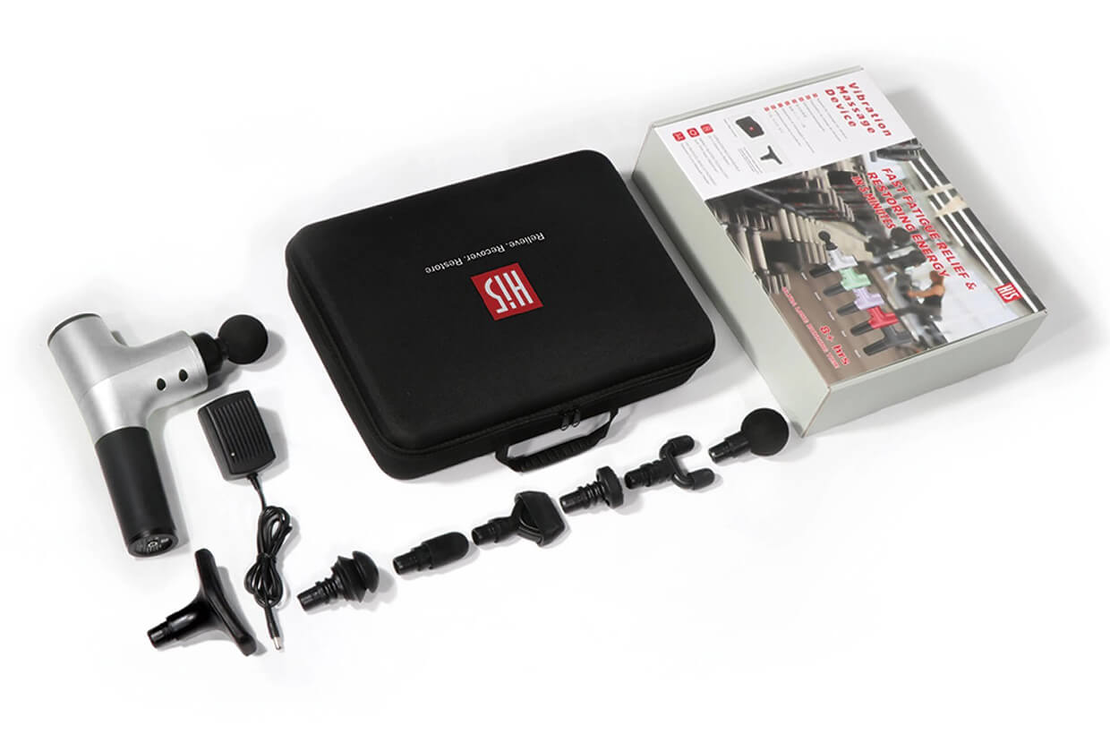 A rezgő pisztoly nejlon tokba csomagolt, minden tartozékával együtt. Minden masszázsfejnek, pisztolytestnek akkumulátorral együtt és a töltőnek megvan a helye a tokban. A nejlon tok praktikus, könnyű, de erős, könnyen tisztítható és védi a rezgő pisztolyt és tartozékait a portól, szennyeződéstől és sérülésektől. A tok szíjjal van ellátva - fogantyú a könnyű hordozhatóság érdekében.