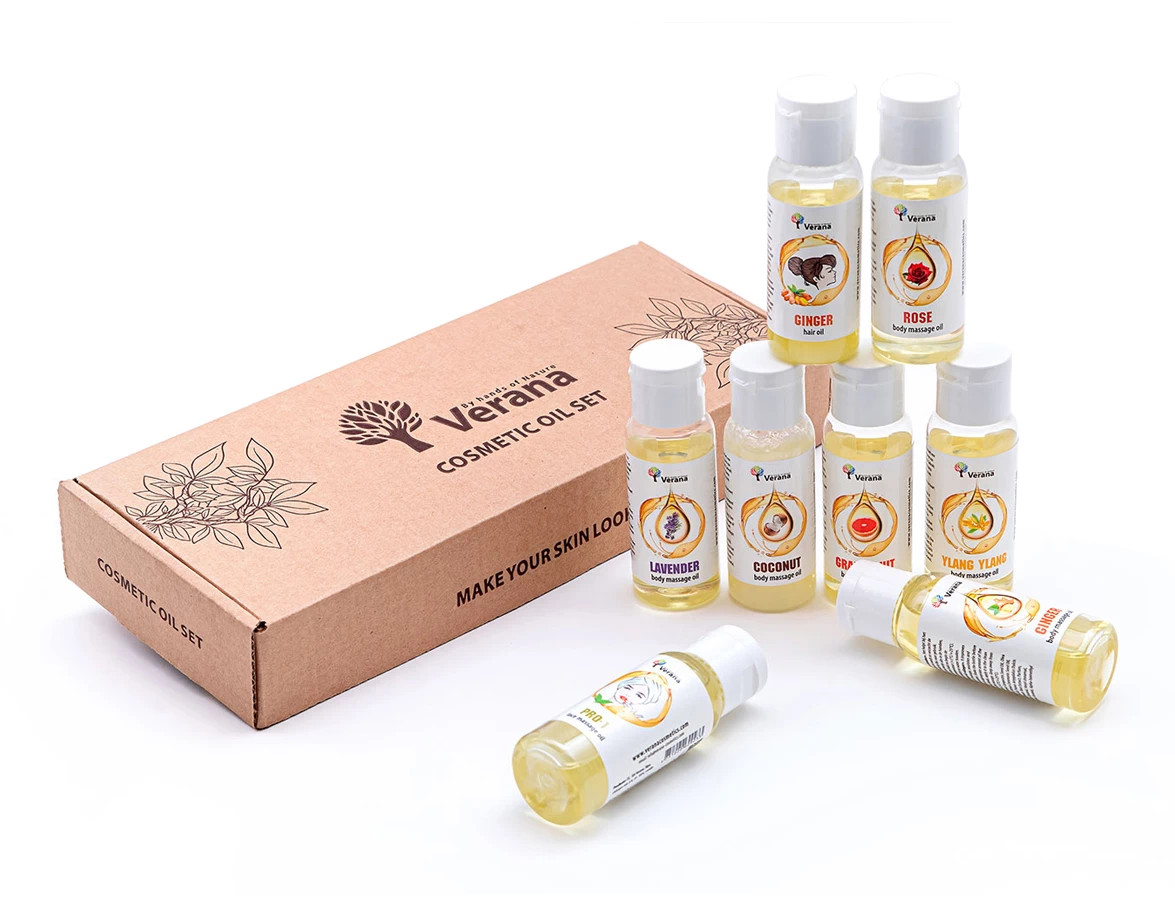 8 db-os masszázsolaj készlet öko papírdobozban, mely ajándéknak vagy tesztkészletnek is alkalmas. Az olajok különböző típusú masszázsokhoz alkalmasak, mindegyik egyedi aromájú és jótékony hatással van a bőrre, arcra vagy hajra.
