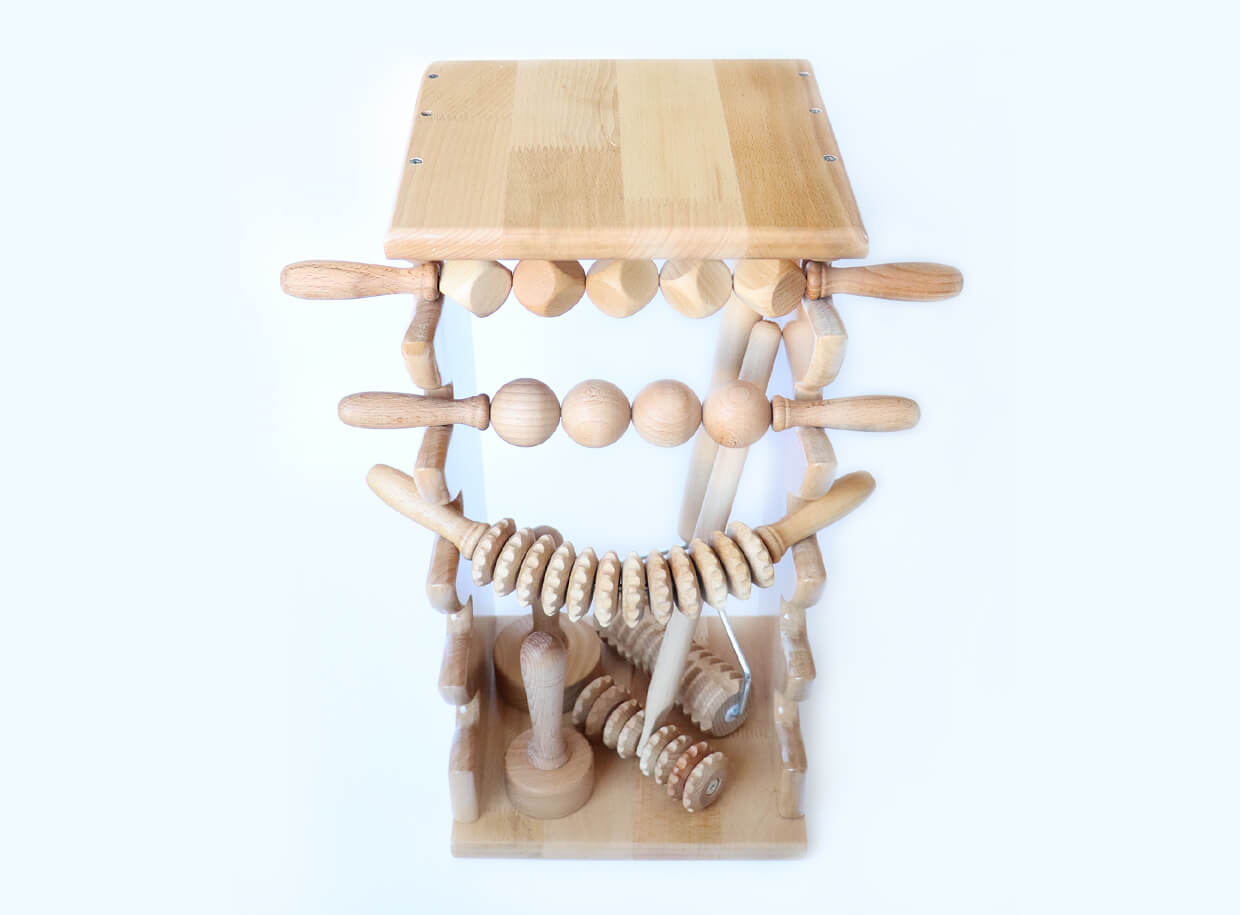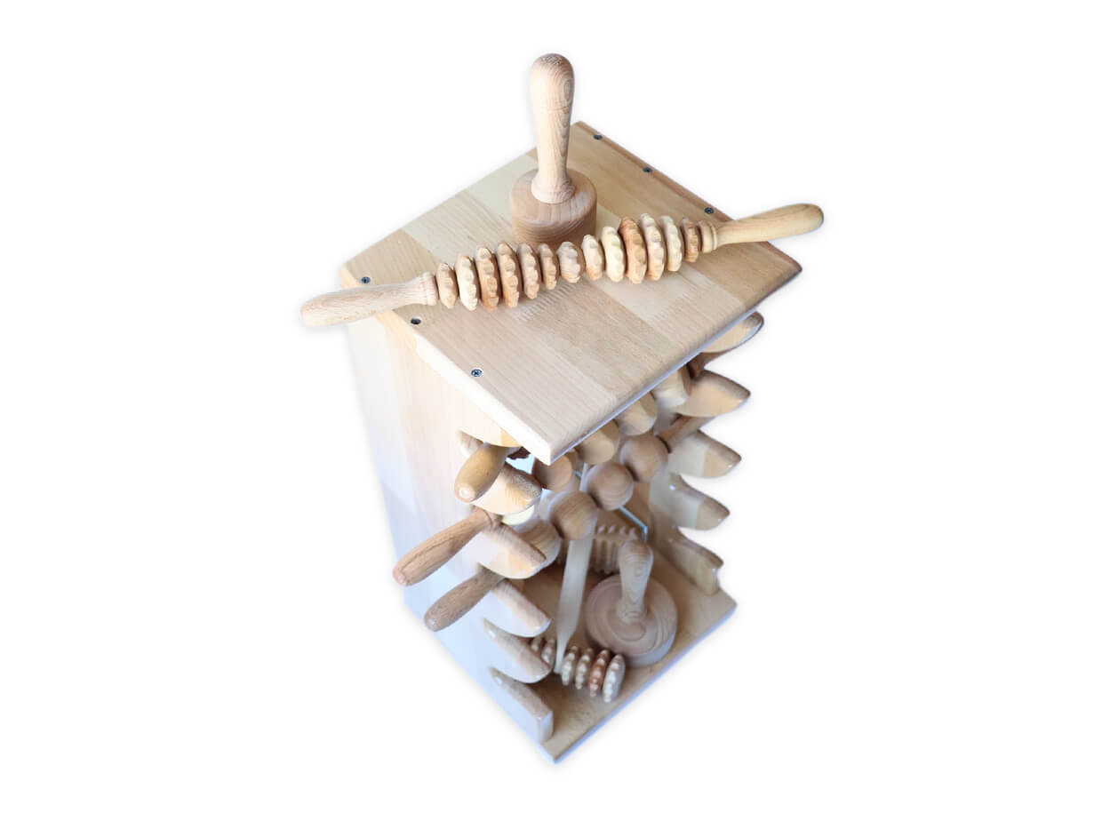 Lakkozott bükkfából készült polcok hengerek és maderoterápiás segédeszközök tárolására. A praktikus polc mindkét oldalán 5 bevágással rendelkezik, melyben a maderoterápiához való görgőket/hengereket tárolhatja. A polc felső és alsó polcai helyet biztosítanak a maderoterápiához szükséges kiegészítő eszközöknek, például lombiknak vagy spatulának.