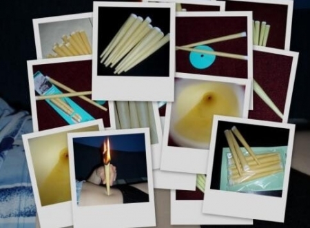 - Az asszisztáló személy begyújtja a gyertyát a szélesebb (fehér) végén, a gyertya szűkebb része be lesz helyezve a köldökbe a géz fölé, vagy a kezelt felületre. Az asszisztáló személy egész idő alatt függőleges helyzetben tartja a gyertyát, és az elégett részeit pinzetta által csípi le.