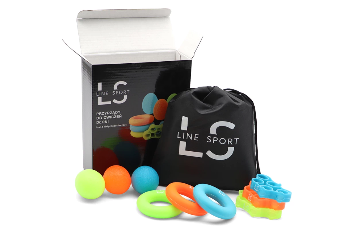 Kilenc rehabilitációs segédeszközből álló készlet a kéz sérülések és műtétek utáni edzésére és erősítésére szolgál. Alkalmas sportolók és olyan emberek számára is, akiknek merevek vagy gyengék az izmaik, például hosszú számítógép előtt ülés után. Az eszközök használhatók fizioterápiás létesítményekben, de az otthon kényelmében is.
