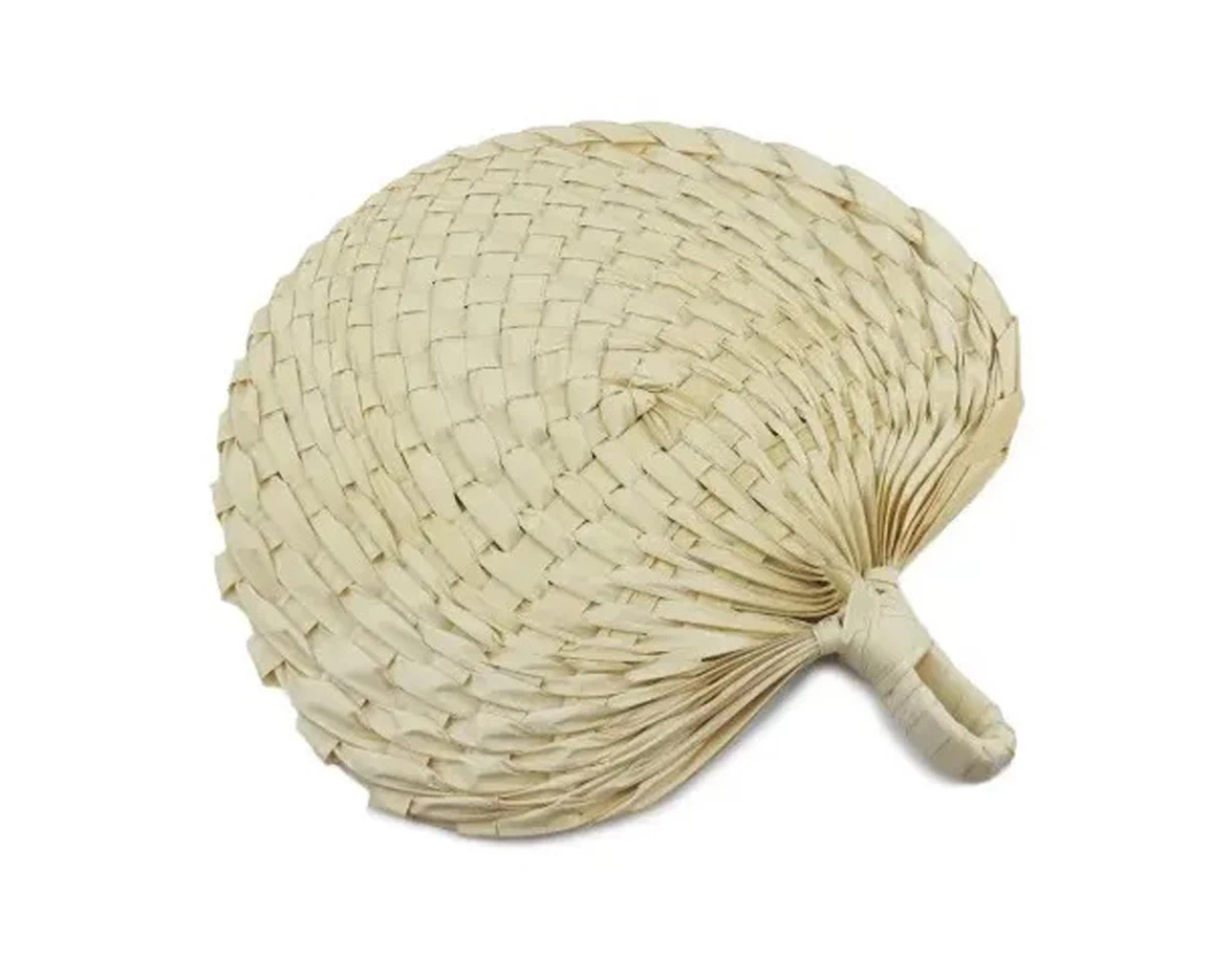 A legyező tisztán természetes anyagból készült. A pálmalevelek tömör félkör alakba vannak fonva, 35 cm átmérőjűek és fogantyúval van ellátva a jobb fogáshoz.