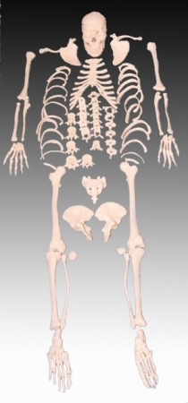 Szétszedett csontváz életnagyságban, koponyával-3 részben, jobb kézzel és lábbal egészben (drótok által összekapcsolva).