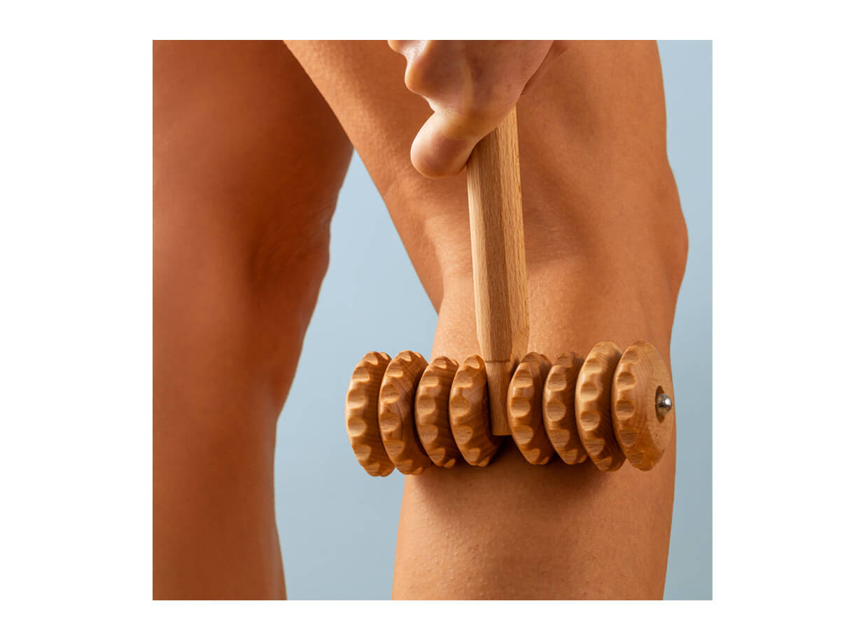 T-alakú masszázs henger fogantyúval és 8 db bükkfa fogaskerékkel. A fogantyú lehetővé teszi a megfelelő nyomás kialakítását a masszázs során és kényelmesen elérheti a kevésbé hozzáférhető testrészeket is az önmasszázs során. A henger alkalmas a problémás testrészek kezelésére, ahol vastagabb bőr alatti zsírréteg, megereszkedett bőr vagy cellulit alakul ki.