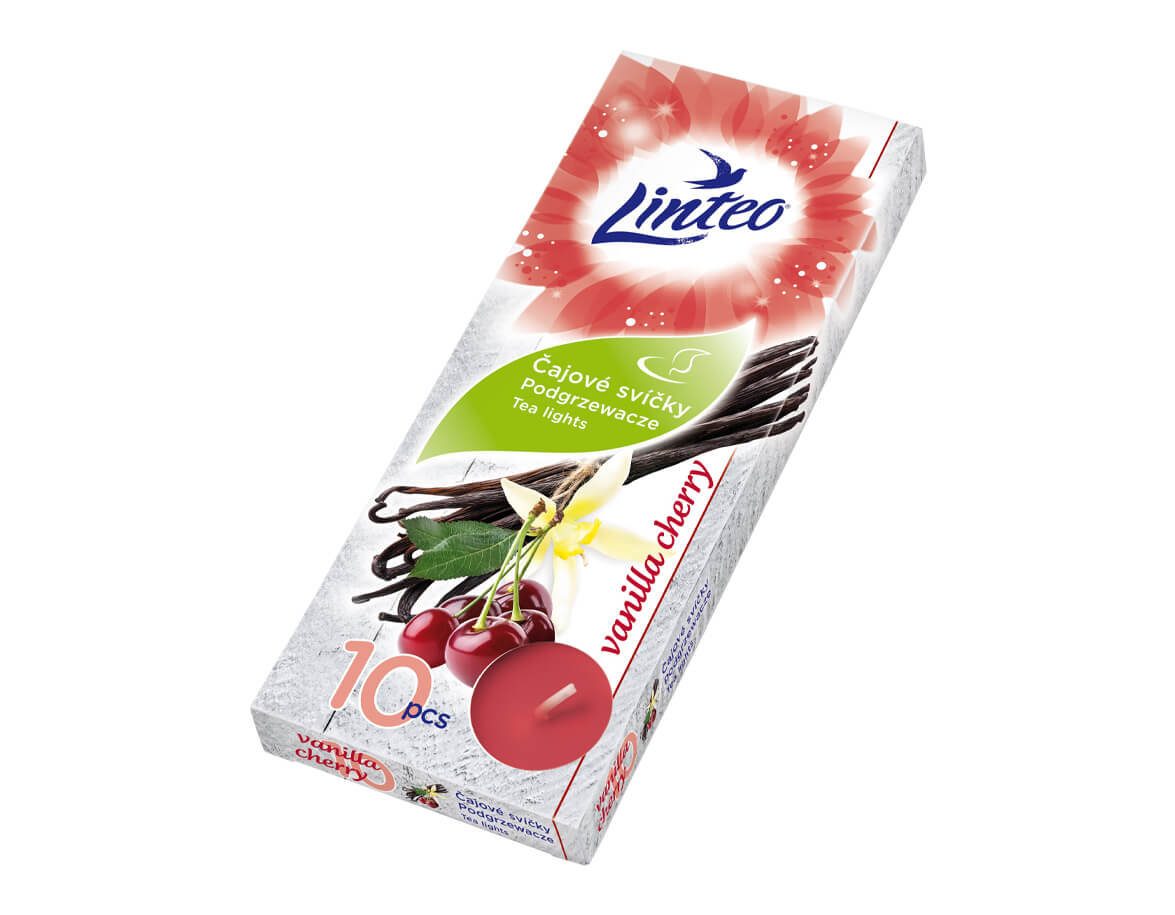 Teagyertya alumínium tálkában, 10 db-os csomagolás cseresznye és vanília illattal. Alkalmas sólámpákhoz, aromalámpákhoz, gyertyatartókhoz, kellemes hangulat megteremtéséhez.