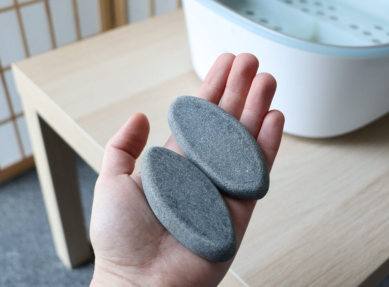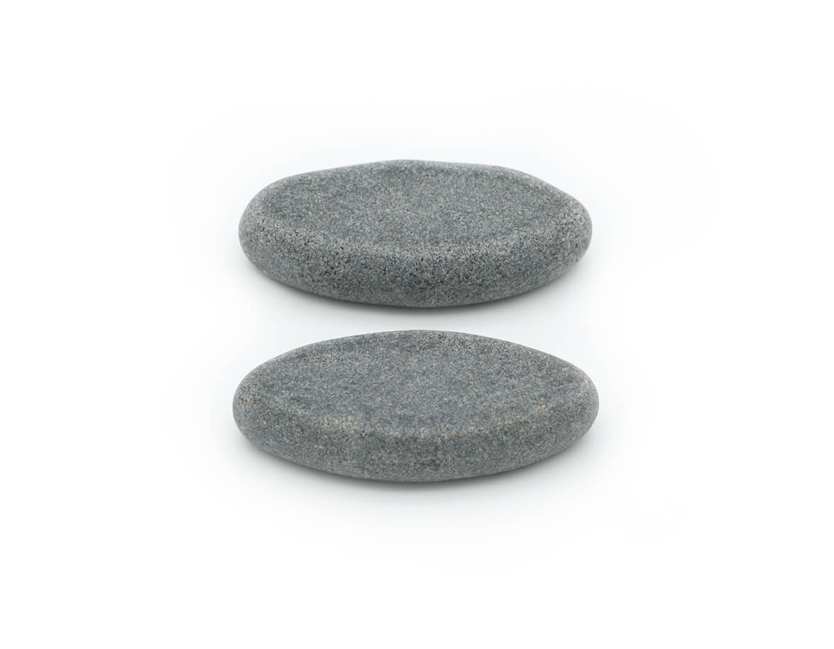 Két, nagyjából azonos méretű (5-7 cm) természetesen formázott bazaltkő, trigger pontok masszírozására.